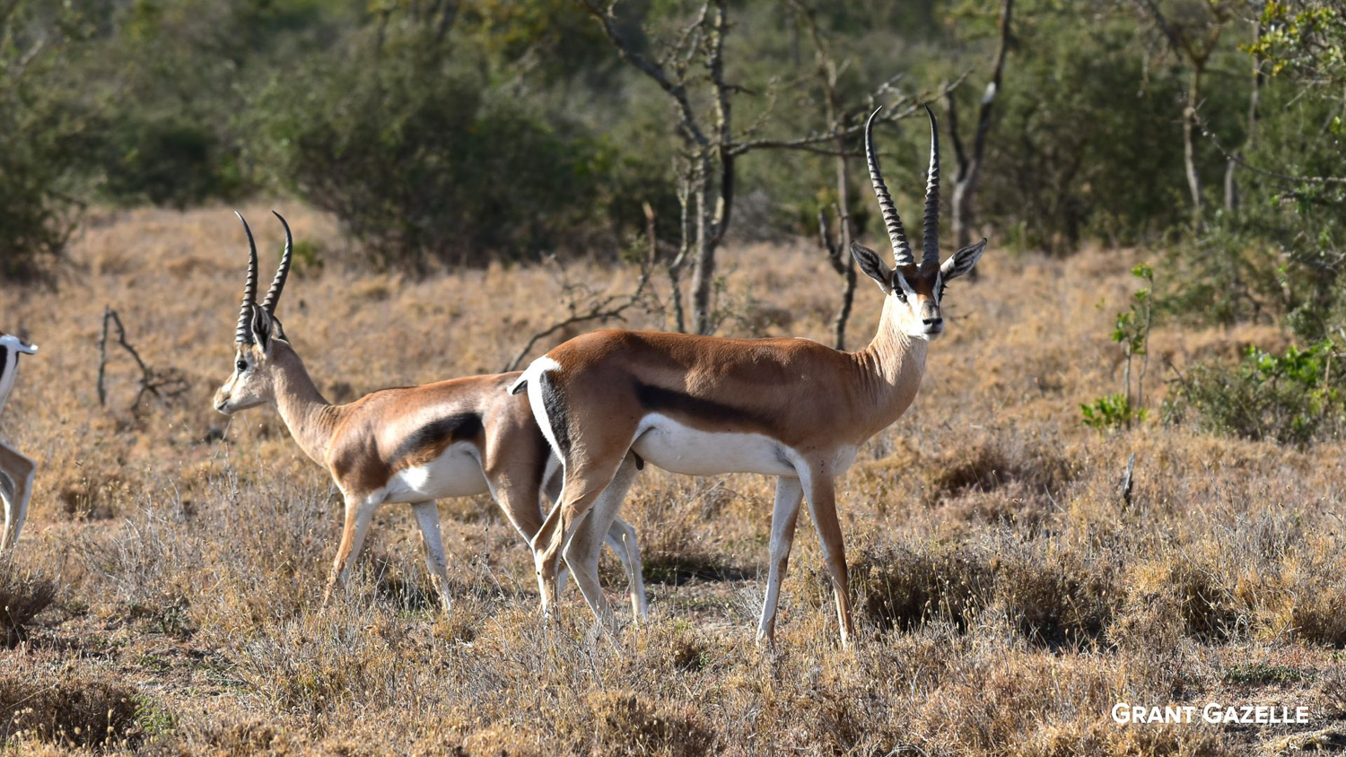 Grant’s Gazelles – This species of Gazelle are primarily browsers, rather than grazers, and a large part of their diet consists of leaves and stems; although, they will eat herbs, foliage, short grasses, and shoots. Grant’s Gazelles are not dependent on water and therefore migrate in the opposite direction to other migratory species such as the Wildebeest. With the ability to obtain the moisture needed from the food they avoid competition and can survive on vegetation found in semi-desert environments.