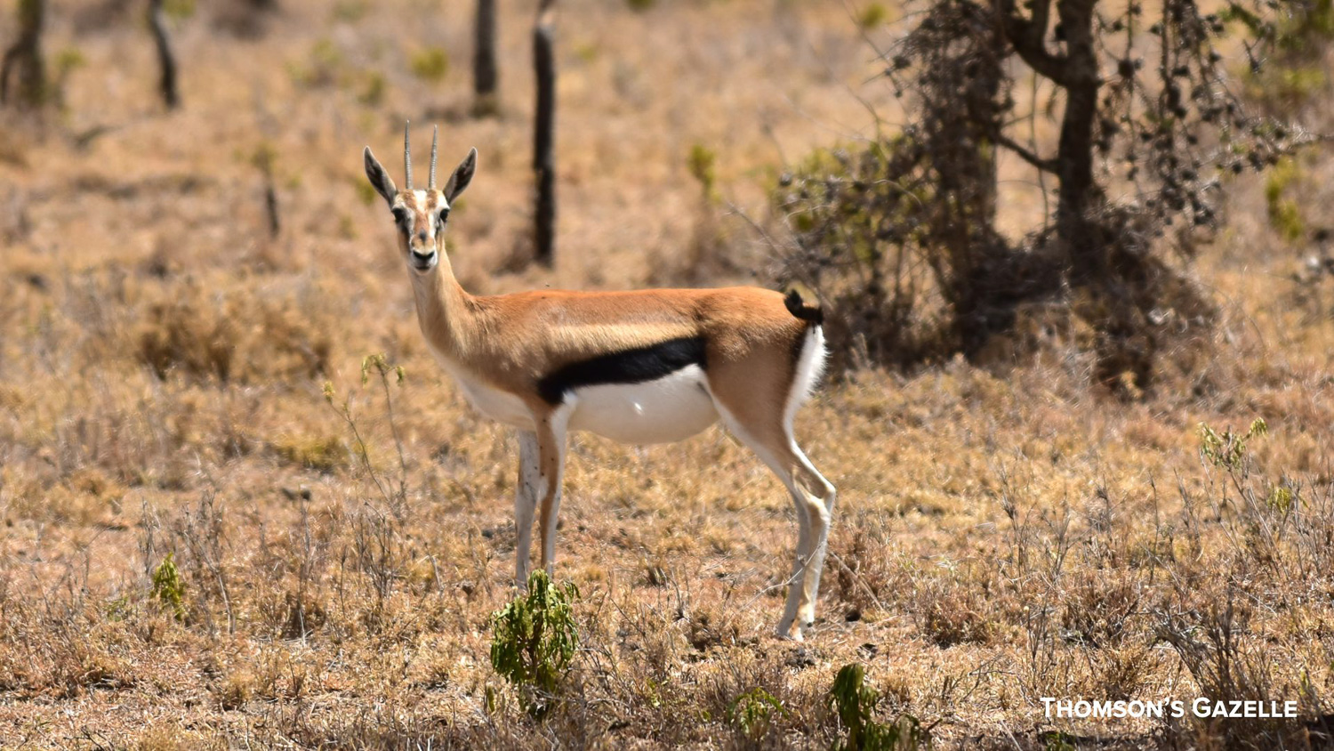 Thomson’s Gazelles – These small Gazelles have light-brown coats with dark stripes running down their sides, a white patch on their rumps extending underneath the tail, and ridged horns that curve backward. Females may have shorter, smoother, and slimmer horns than males or none at all. Grant’s gazelles are sometimes confused with the smaller Thomson’s.