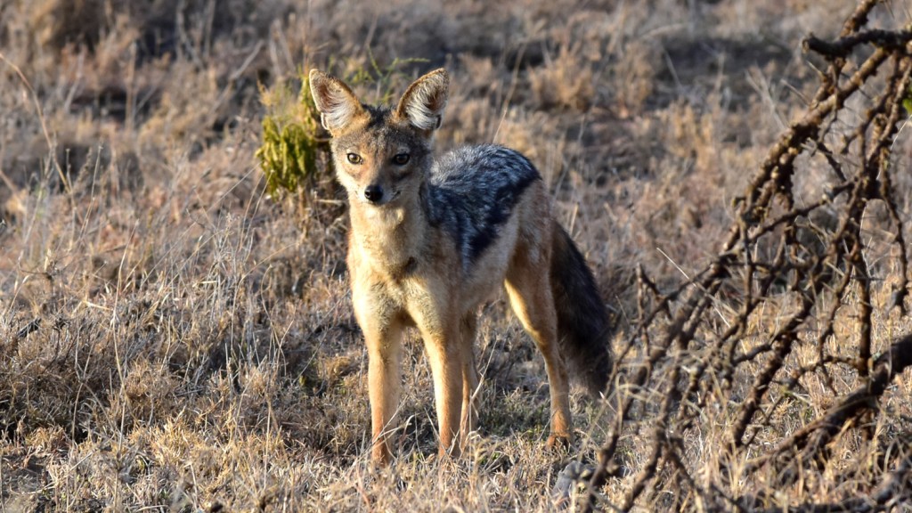 Silver-Backed Jackal – Jackals are among the few mammalian species in which the male and female mate for life. Mated pairs are territorial, and both the female and male mark and defend their territory. Litters average two to four pups. The mother changes den sites about every two weeks, so the young are less likely to be found by predators. Jackal pups are suckled and fed regurgitated food until they are about two months old. By six months, they are hunting on their own.