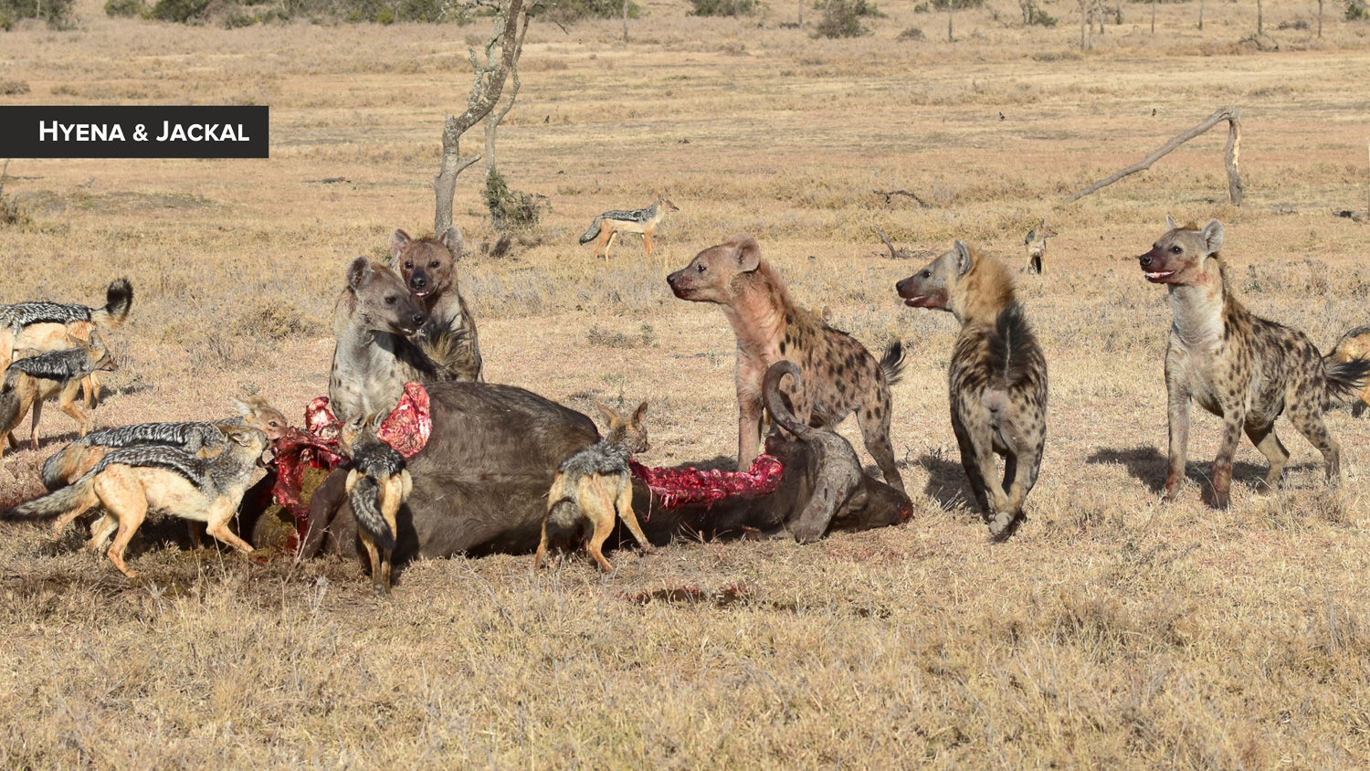 Jackals can best be described as opportunistic omnivores. They cooperatively hunt small antelopes and also eat reptiles, insects, ground-dwelling birds, fruits, berries, and grass. They will pick over kills made by large carnivores and we saw evidence where Lions were openly tolerating the presence of Jackals after a kill.