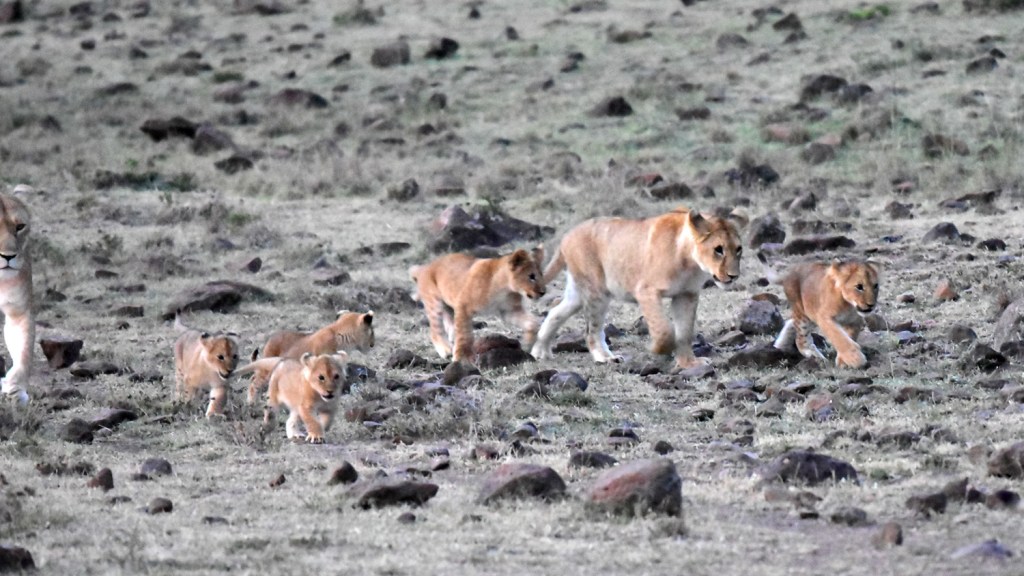 Part of the ‘Offbeat’ Pride at dusk. The pride was on its way to find a safe place for the night. The two month-old cubs have recently joined the main pride having been with their Mum in a den for the first month of their lives.