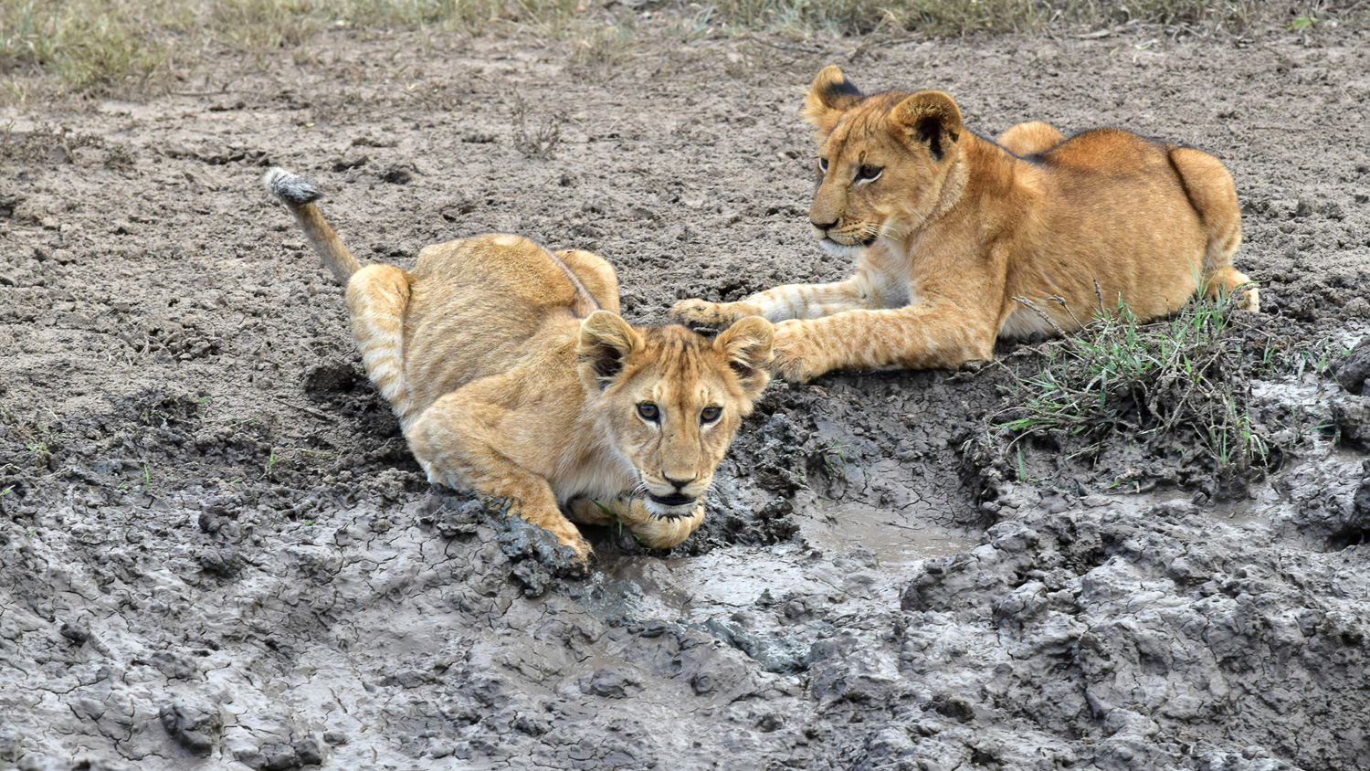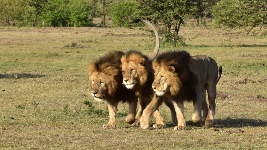 All three males had formed a close bond during their ‘bachelor’ days and now the dominant male tolerated the other two within the pride. The dominant male asserted his rights over the females, but if more than one female was ovulating, the other two males were able to mate with her. For their part the less dominant males helped patrol the territory. On this occasion, they were doing it altogether!