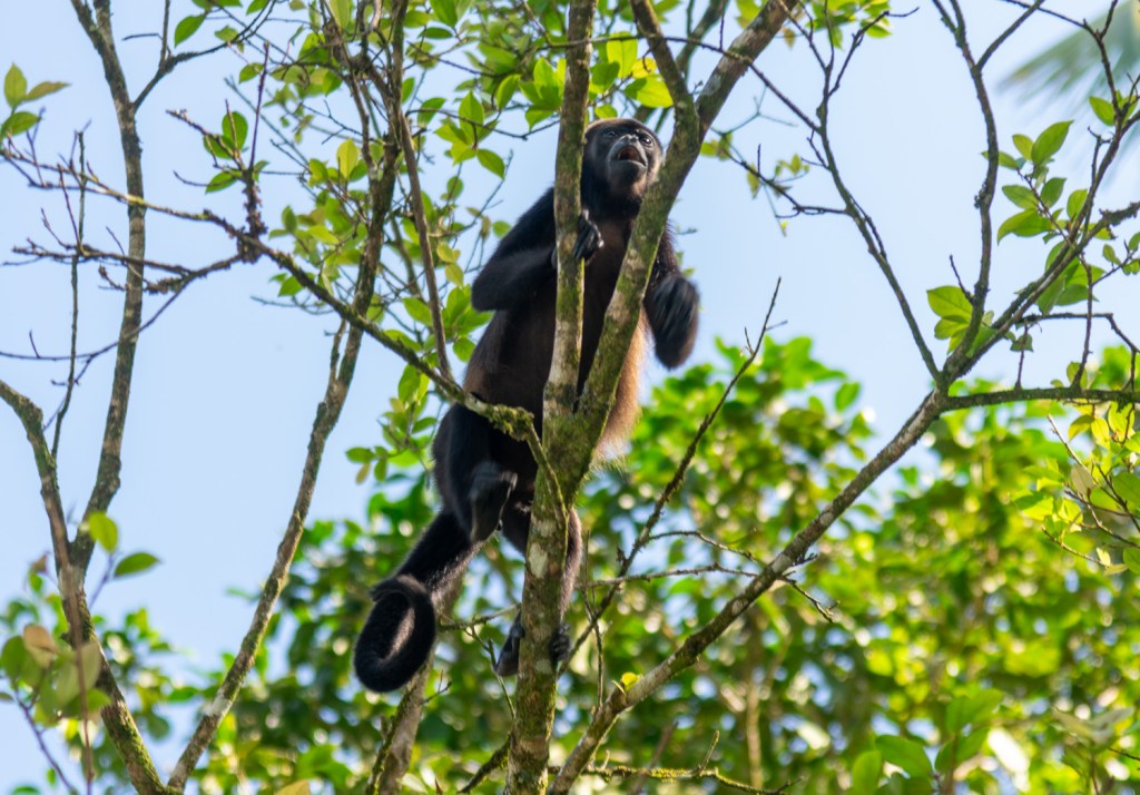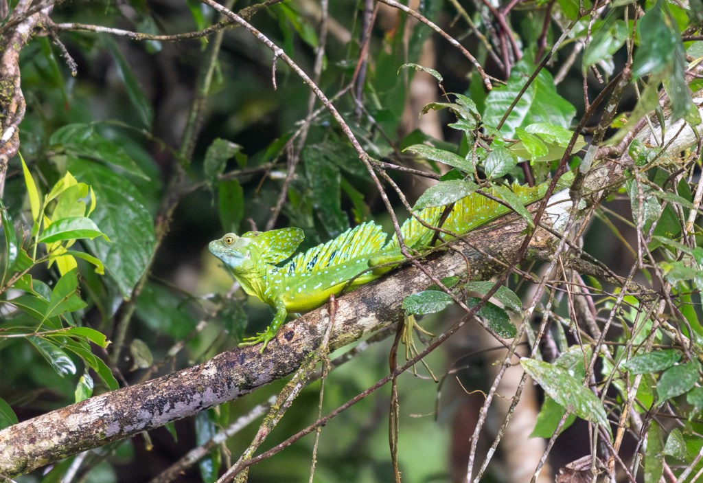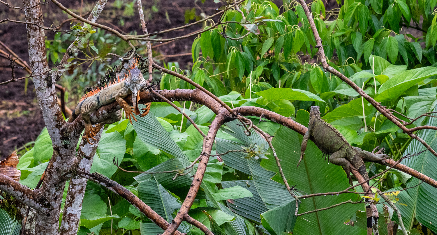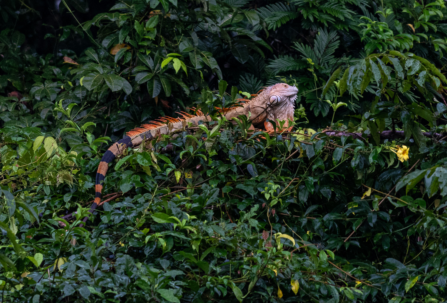 This 6-foot long male Green Iguana, which changes colour to orange when trying to attract a female, is perched high up in the trees.
