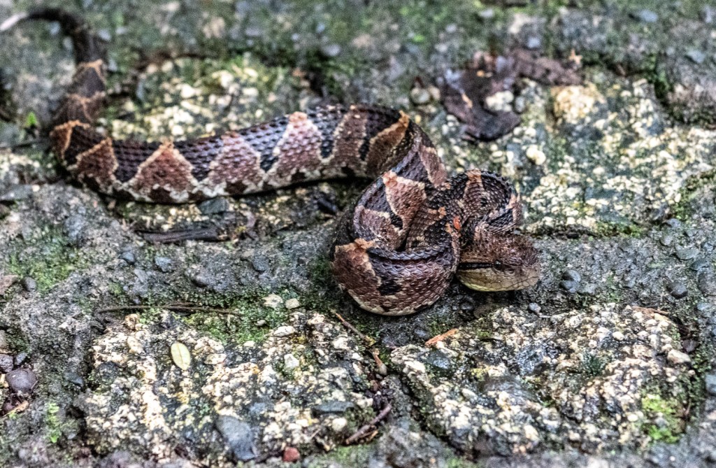 Jumping Pitviper, is venomous and one of the most dangerous snakes in Costa Rica. It measures approx 25 inches in length and is usually found under fallen leaves on the ground, so hikers need to take when walking through forest. This example was found on the trail path and was soon removed by a ranger.