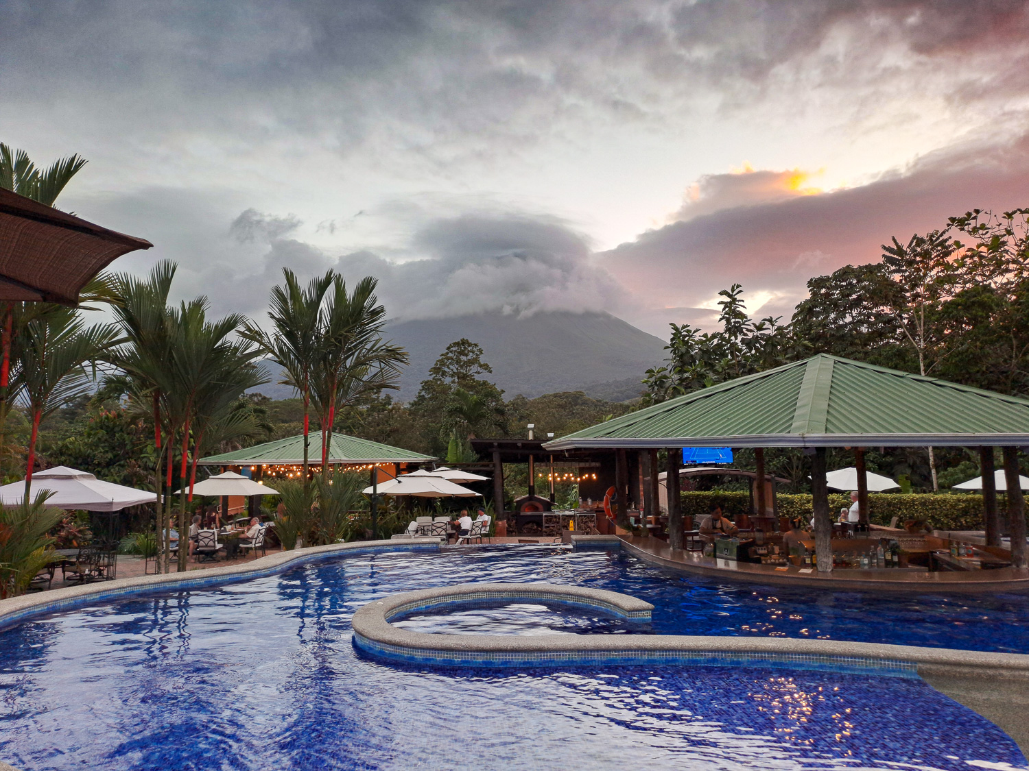 Swimming Pool at sunset, with views of the cloud covered Arenal Volcano