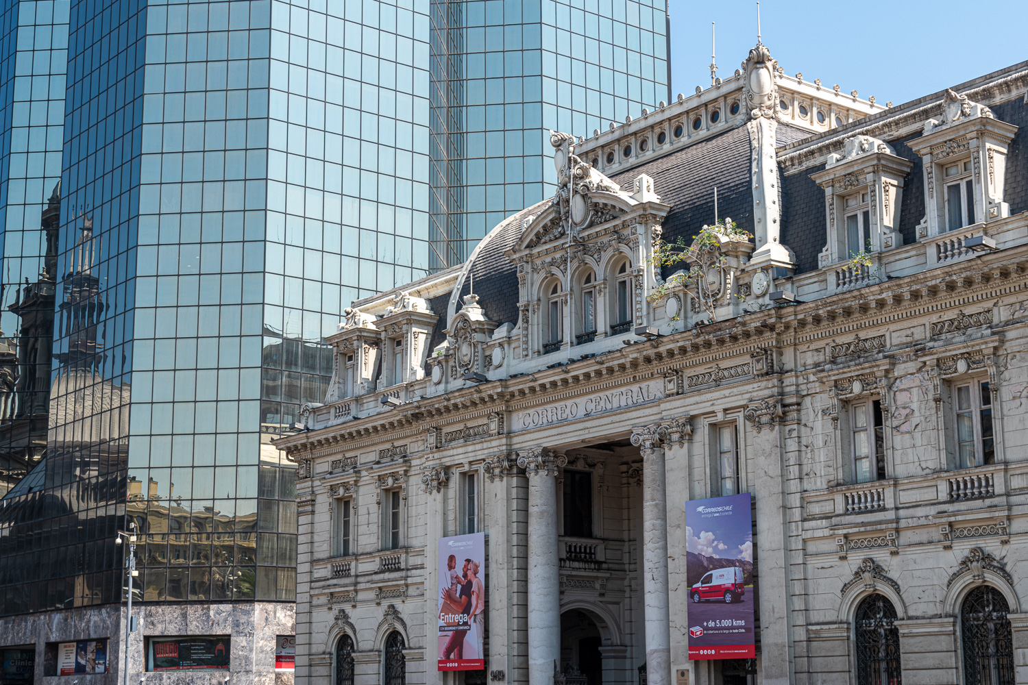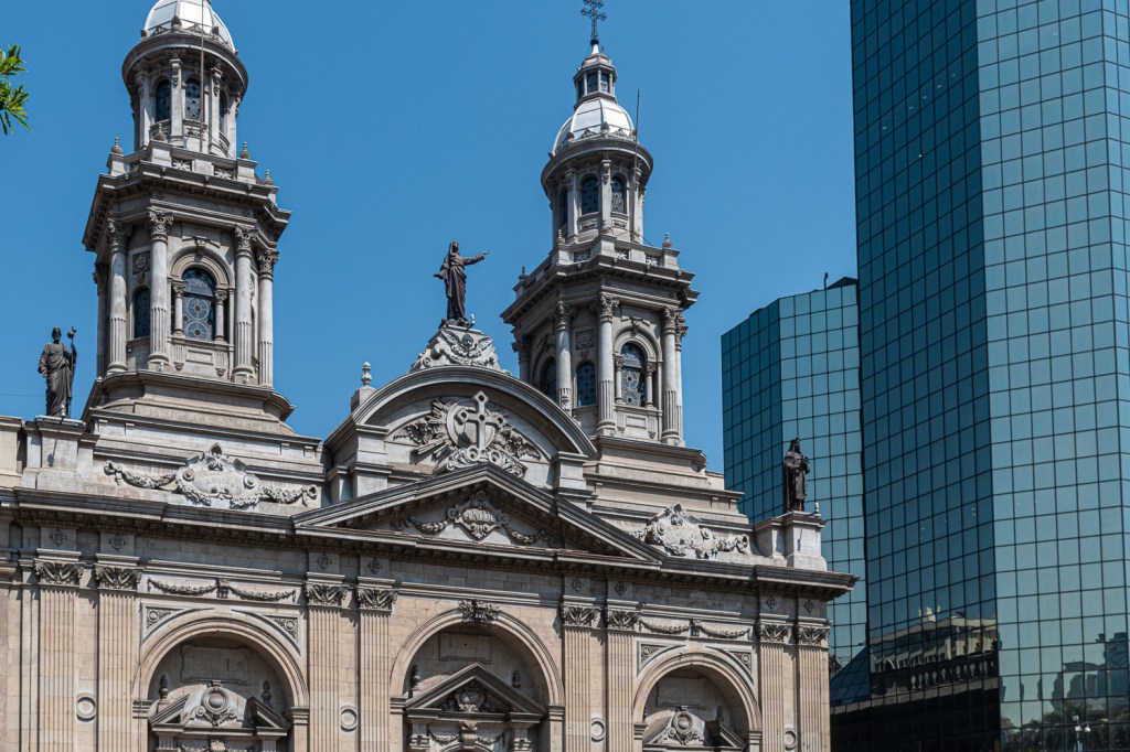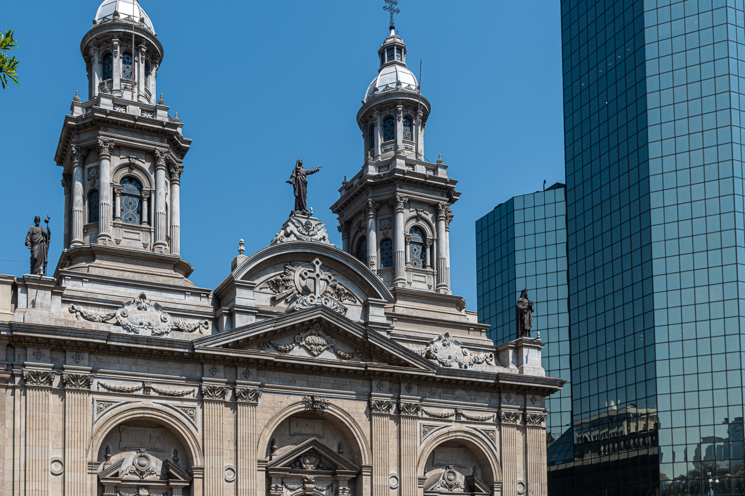 The old and the new – The Metropolitan Cathedral, Chile’s main Catholic church, sits in the Plaza de la Armas in contrast to the modern skyscraper behind