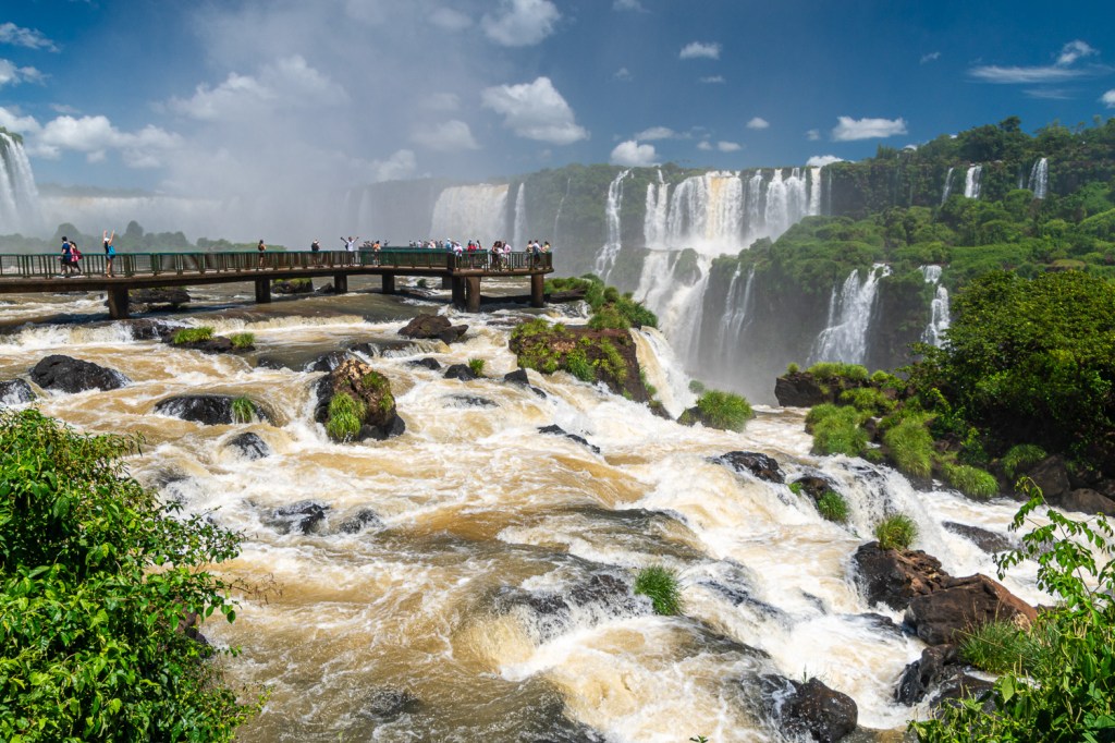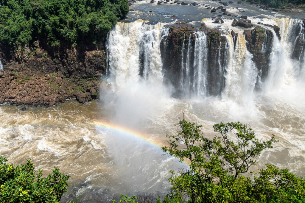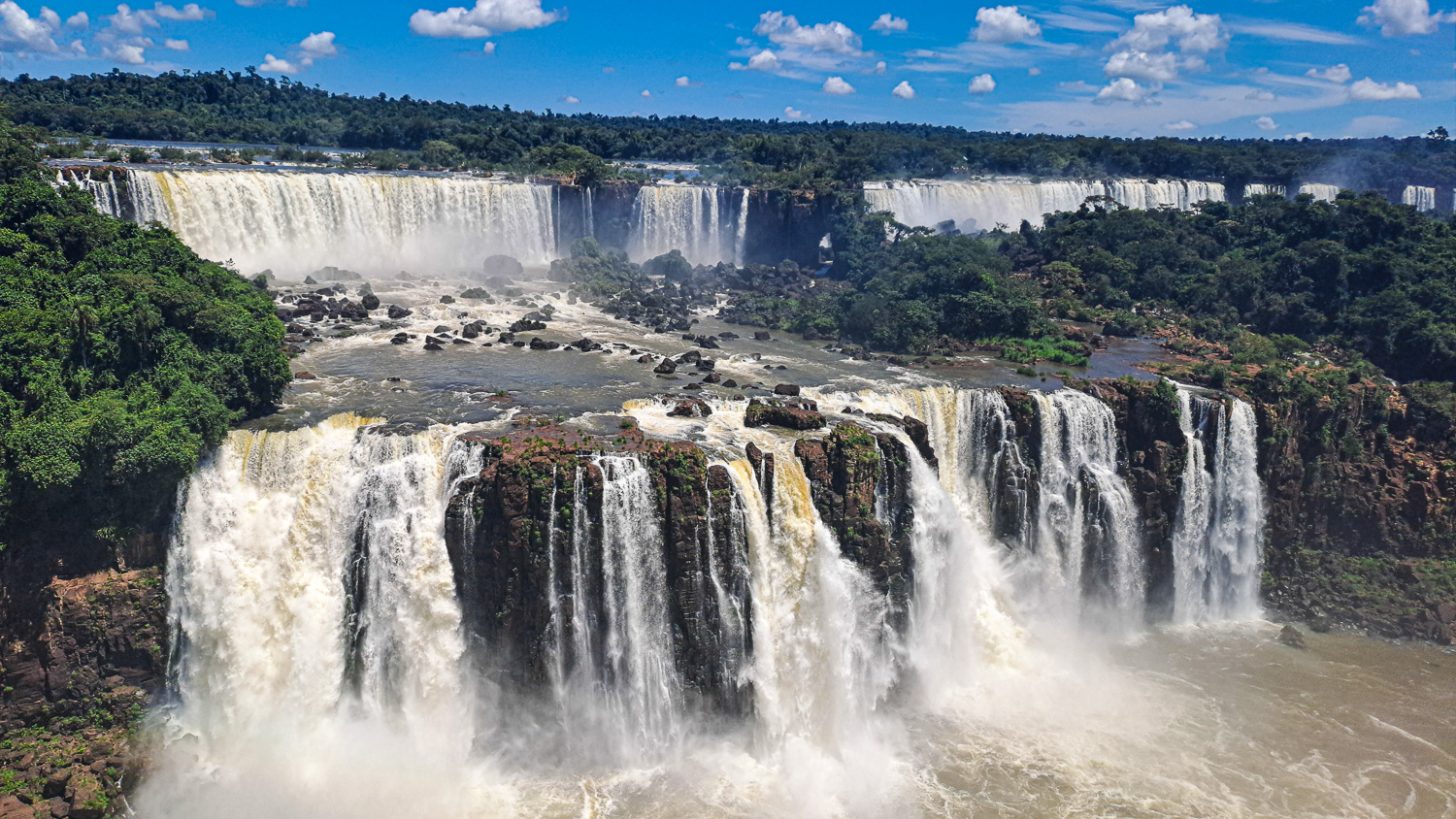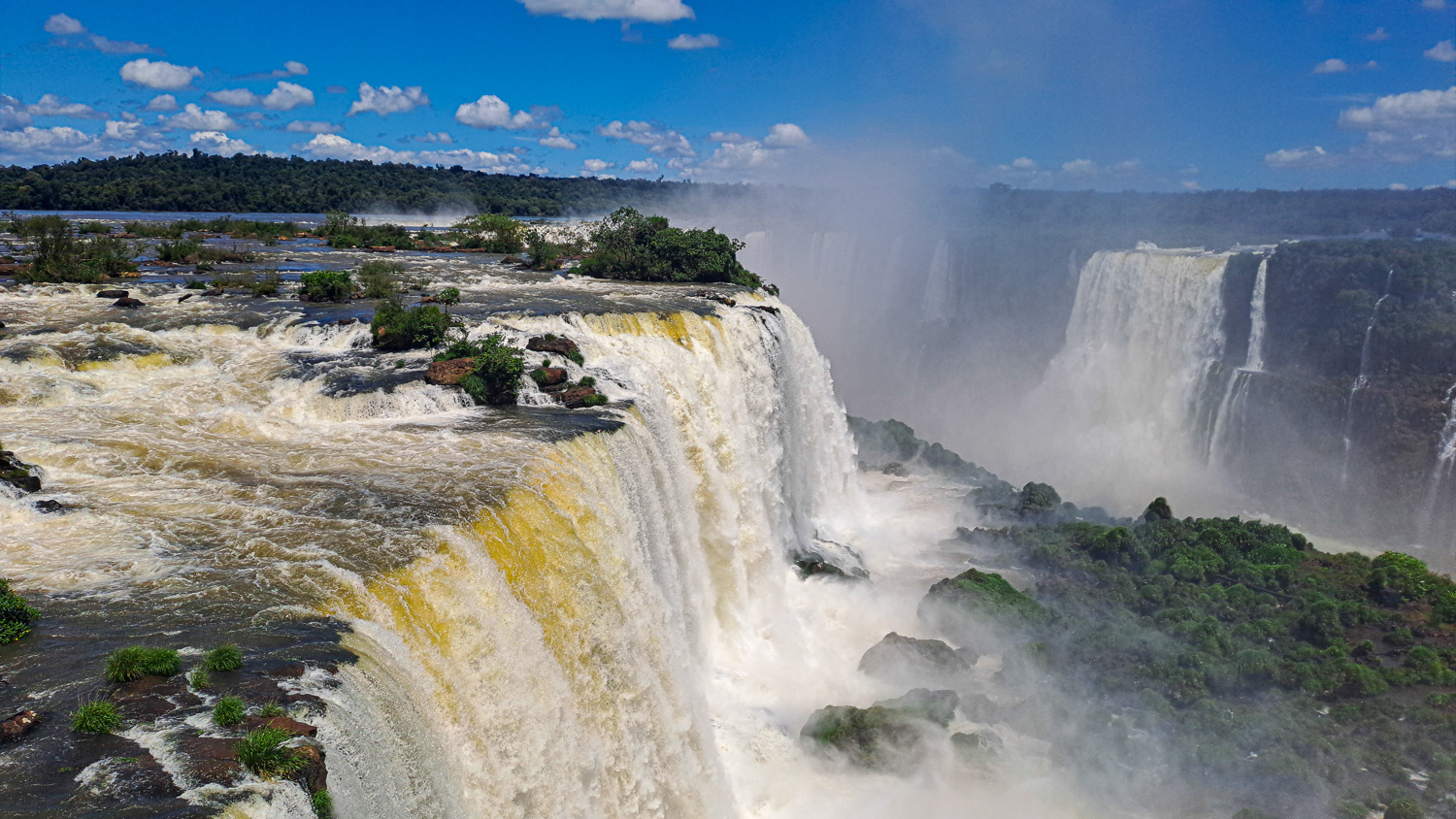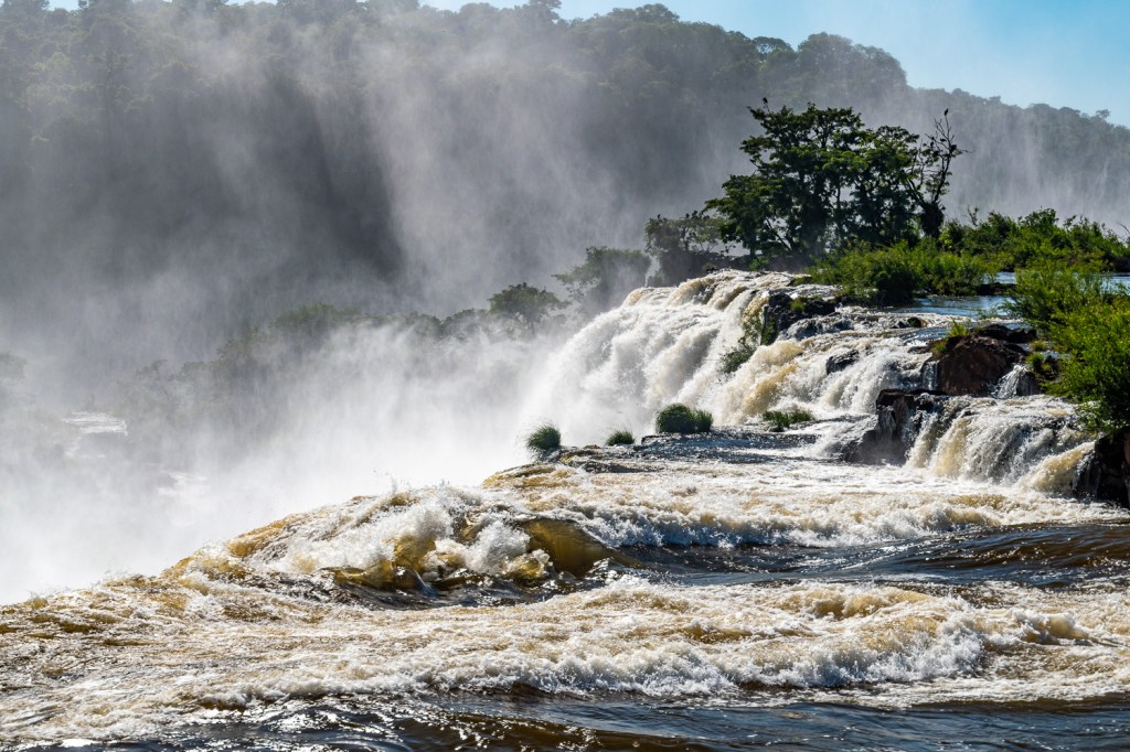 Iguazú Falls are waterfalls of the Iguazu River on the border of the Argentine province of Misiones and the Brazilian state of Paraná. Together, they make up the largest waterfall system in the world. The falls divide the river into the upper and lower Iguazú. The falls can be explored from both the Brazilian and Argentinian sides.
