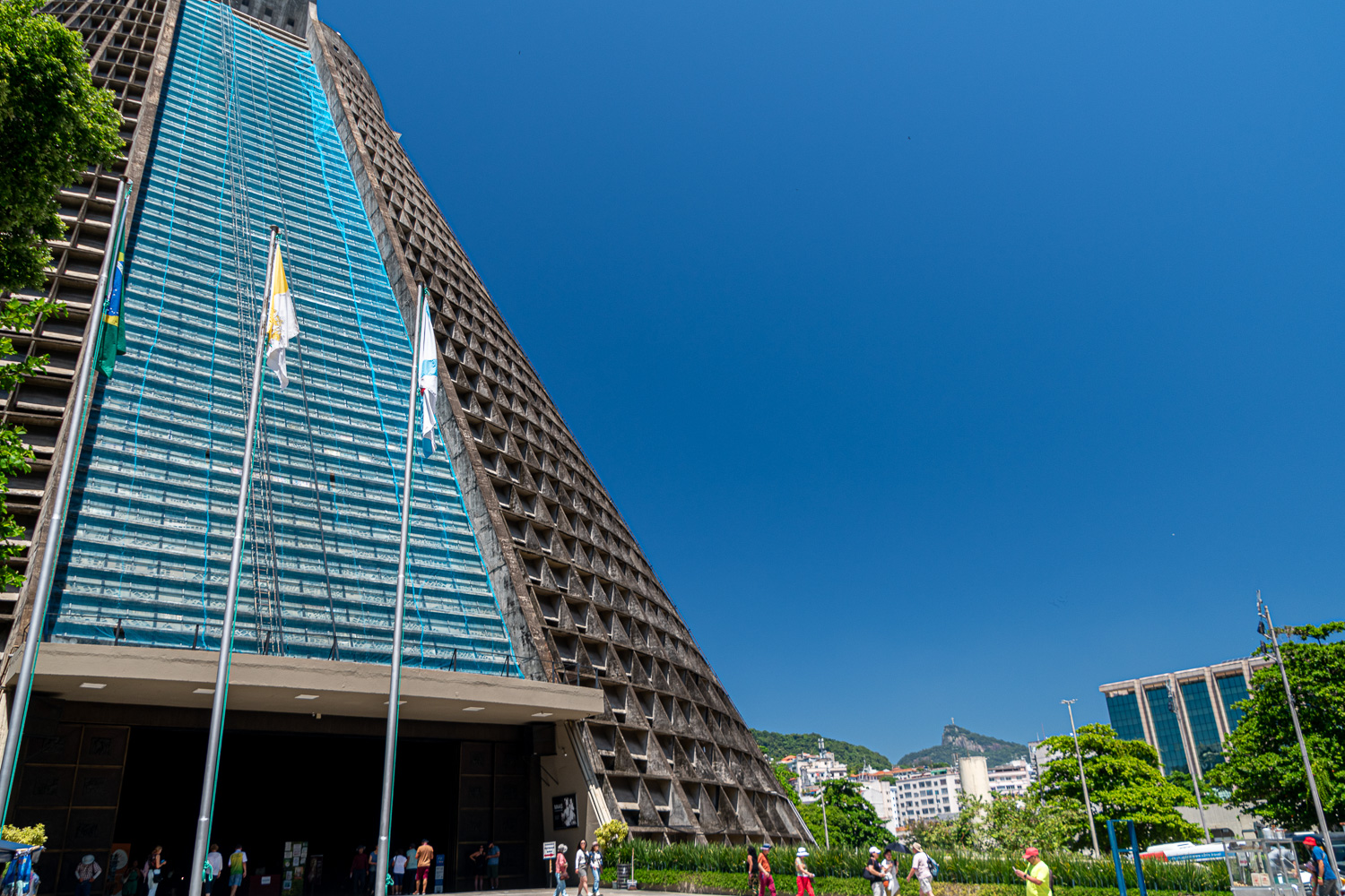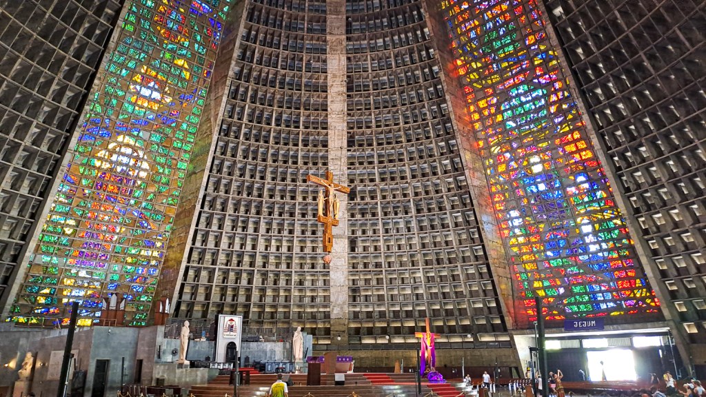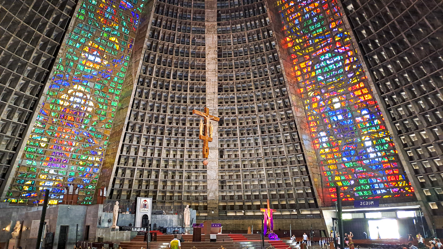 We then headed into the city to visit the extraordinary Metropolitan Cathedral of Saint Sebastian. The New Cathedral, as it is sometimes called, was built in 1979 and is located in the centre of the city. It is conical in form with a 315 ft internal diameter and an overall height of 246 ft. Inside, the area has seating for 5,000, with a standing-room only capacity for 20,000 people. However, the stunning feature of this cathedral is its four rectilinear stained glass windows, which soar 210 ft from floor to ceiling. Joining the four stained glass panels is a glass cross in the roof.