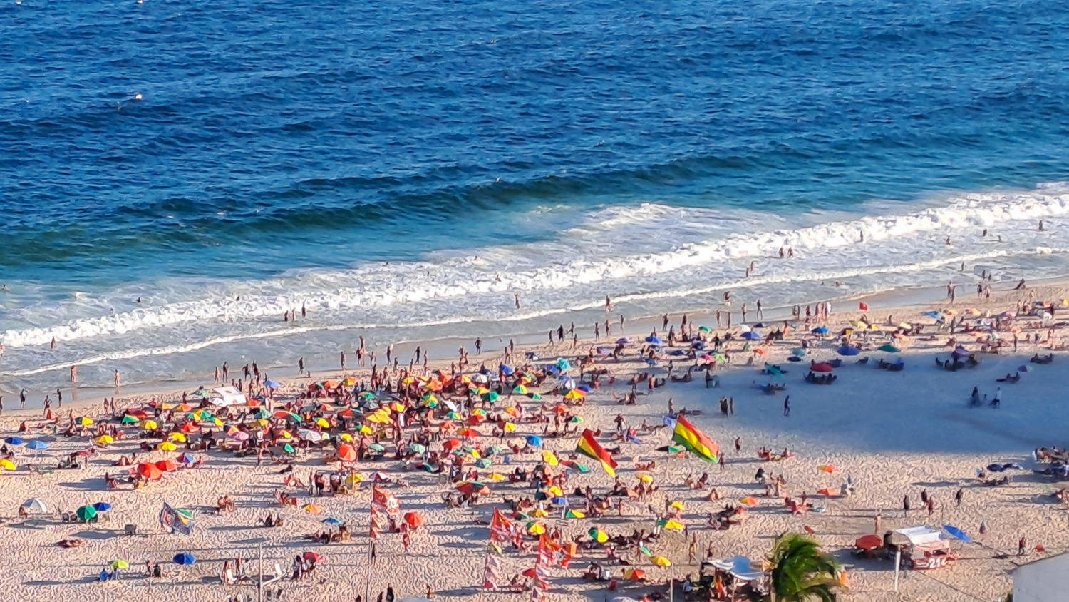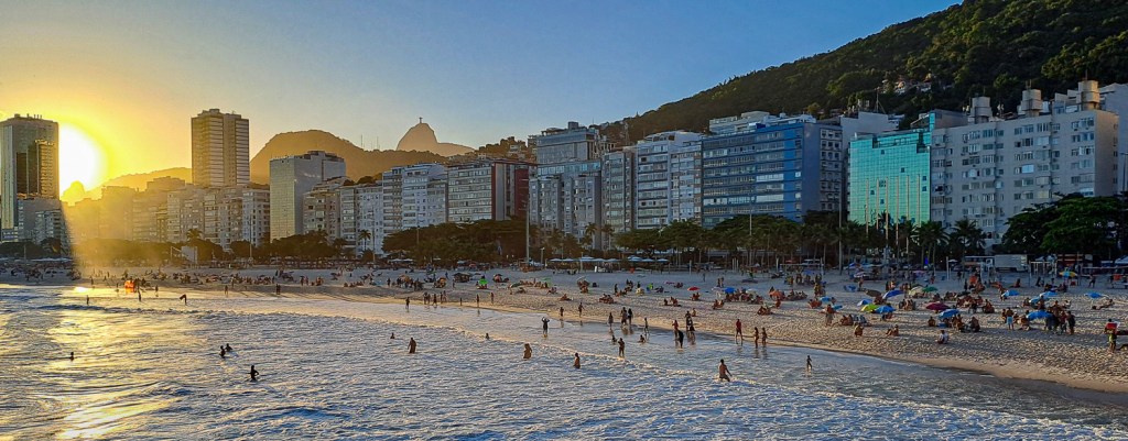 The beach is still busy as the sun sets in the early evening – the Christ the Redeemer can be seen in the far distance