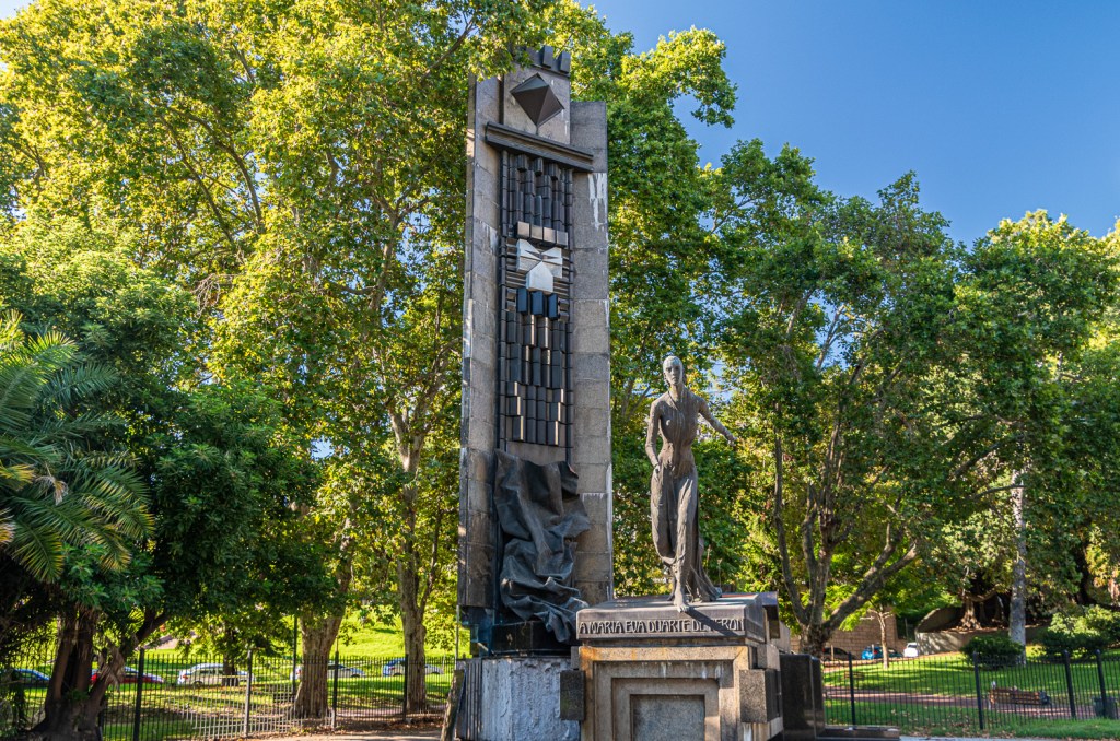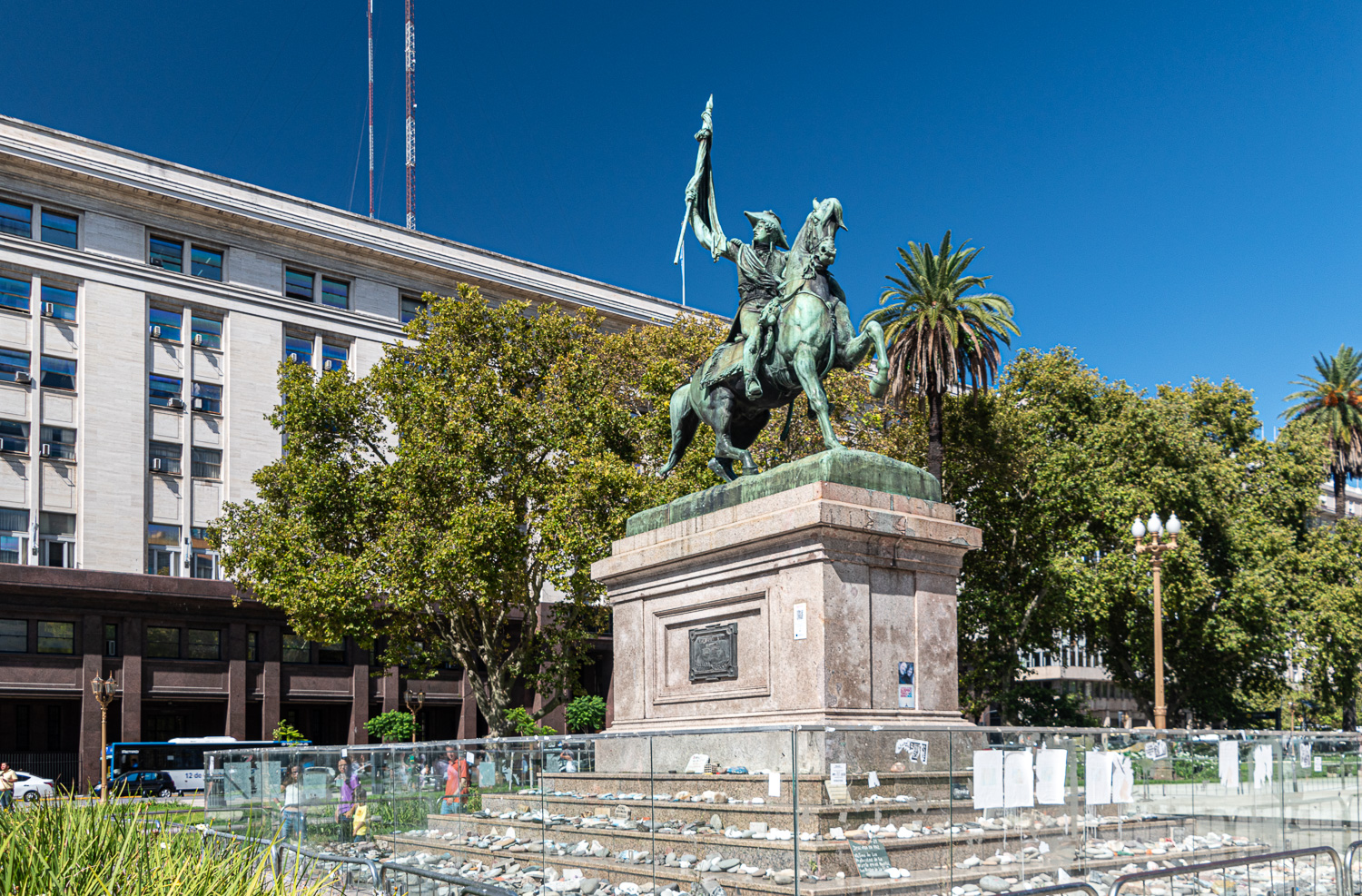 This statue depicts General Manuel Belgrano holding the Flag of Argentina. He took part in the Argentine Wars of Independence and designed what became the flag of Argentina. Argentines regard him as one of the main Founding Fathers of the country. During the 2020 pandemic, families who lost love ones placed an inscribed stone at the foot of the monument as an memorial.