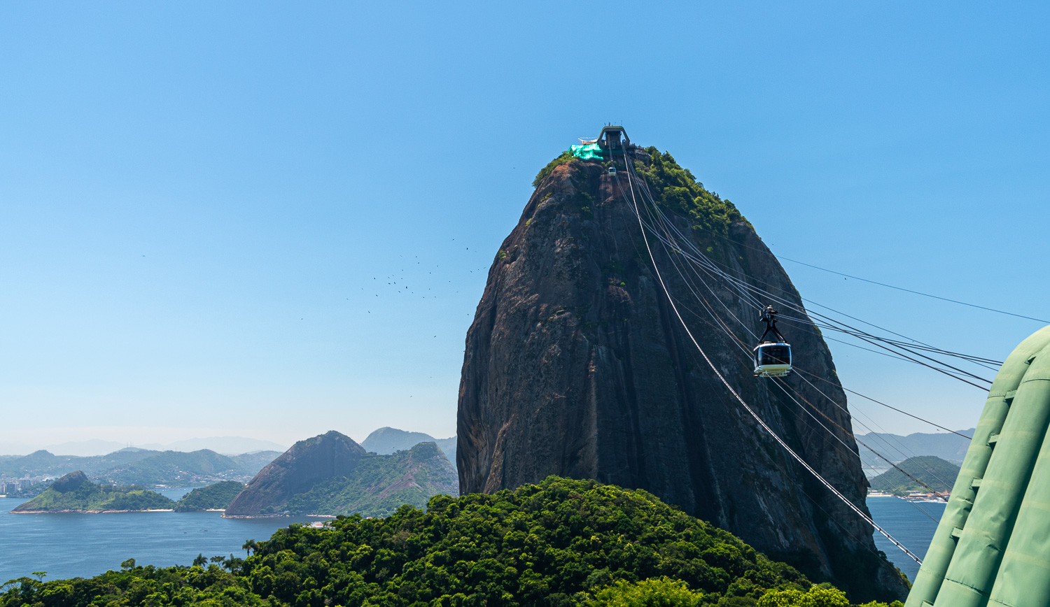 View from across the bay of Sugarloaf Mountain, on the left, and the second stage cable car. The green covering at the top of the mountain is building works for a new zip line attraction!