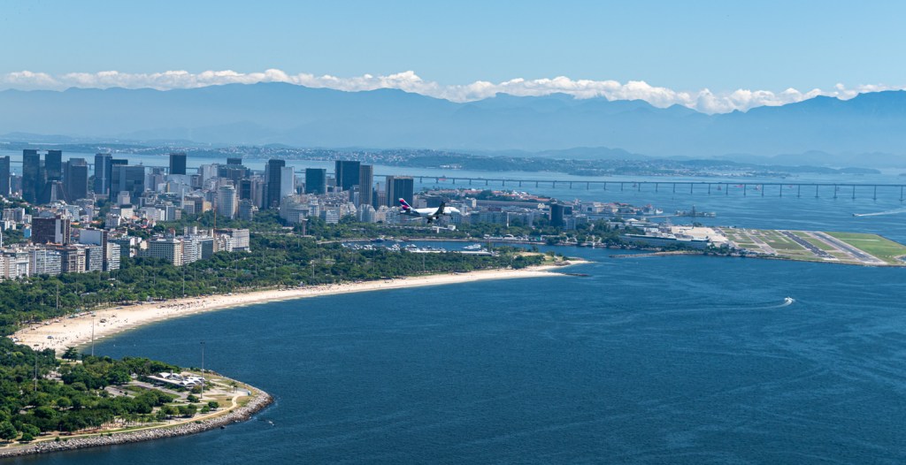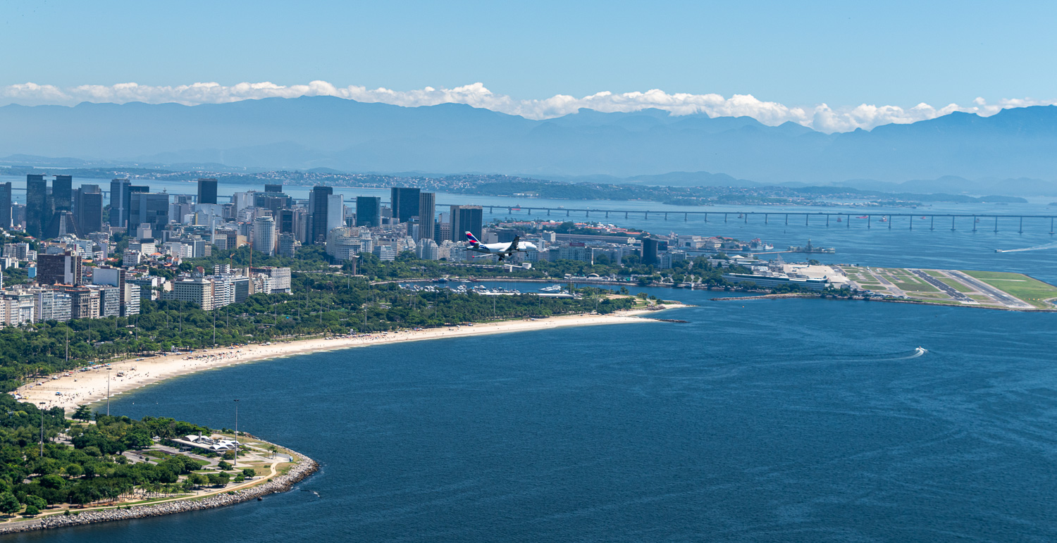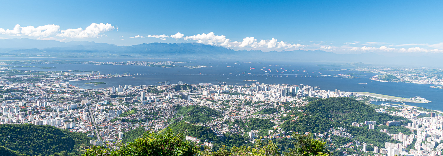 This panorama shows the 8-mile long Rio–Niterói Bridge spanning Guanabara Bay, connecting the cities of Rio de Janeiro and Niterói. It is currently the second longest bridge in Latin America. Its central span is 236 ft high in order to allow the passage of hundreds of ships entering and leaving the bay every month.