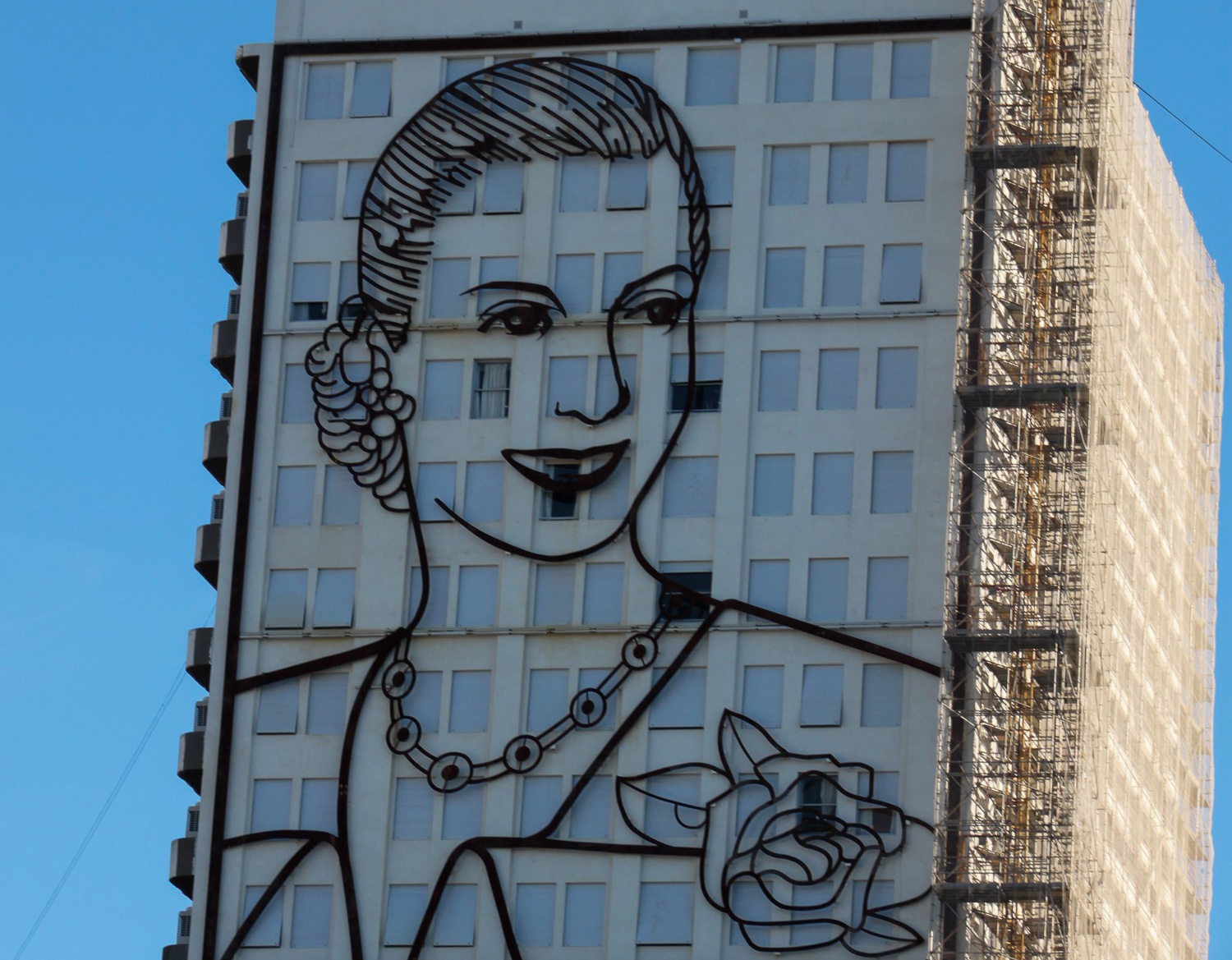 There are two huge images found in the Ministry of Public Works Building, on each side of the south and north facades. The 90 ft high and 75 ft wide steel figures were installed in 2011. The face that looks towards the south of Buenos Aires, has the portrait of Evita, kind and smiling, since the working-class neighbourhoods and factory areas are located on this side of the city. On the north side, the most aristocratic area of the city, there is an image of a more combative Eva, giving a speech to the people. Denoting that the murals align with the historical division of Buenos Aires.