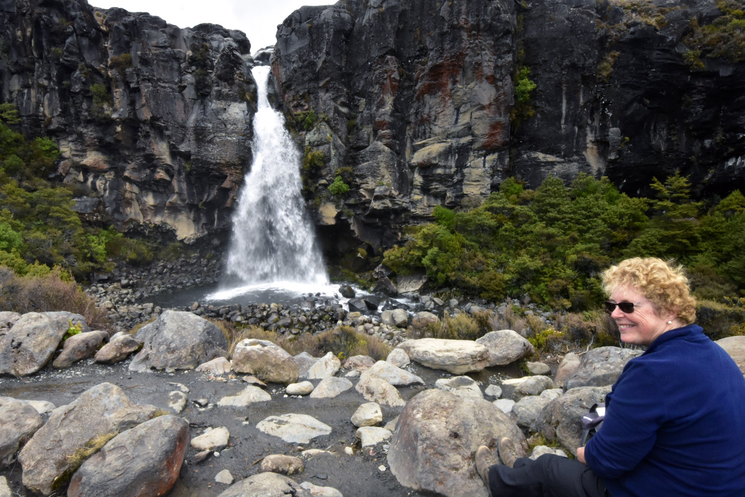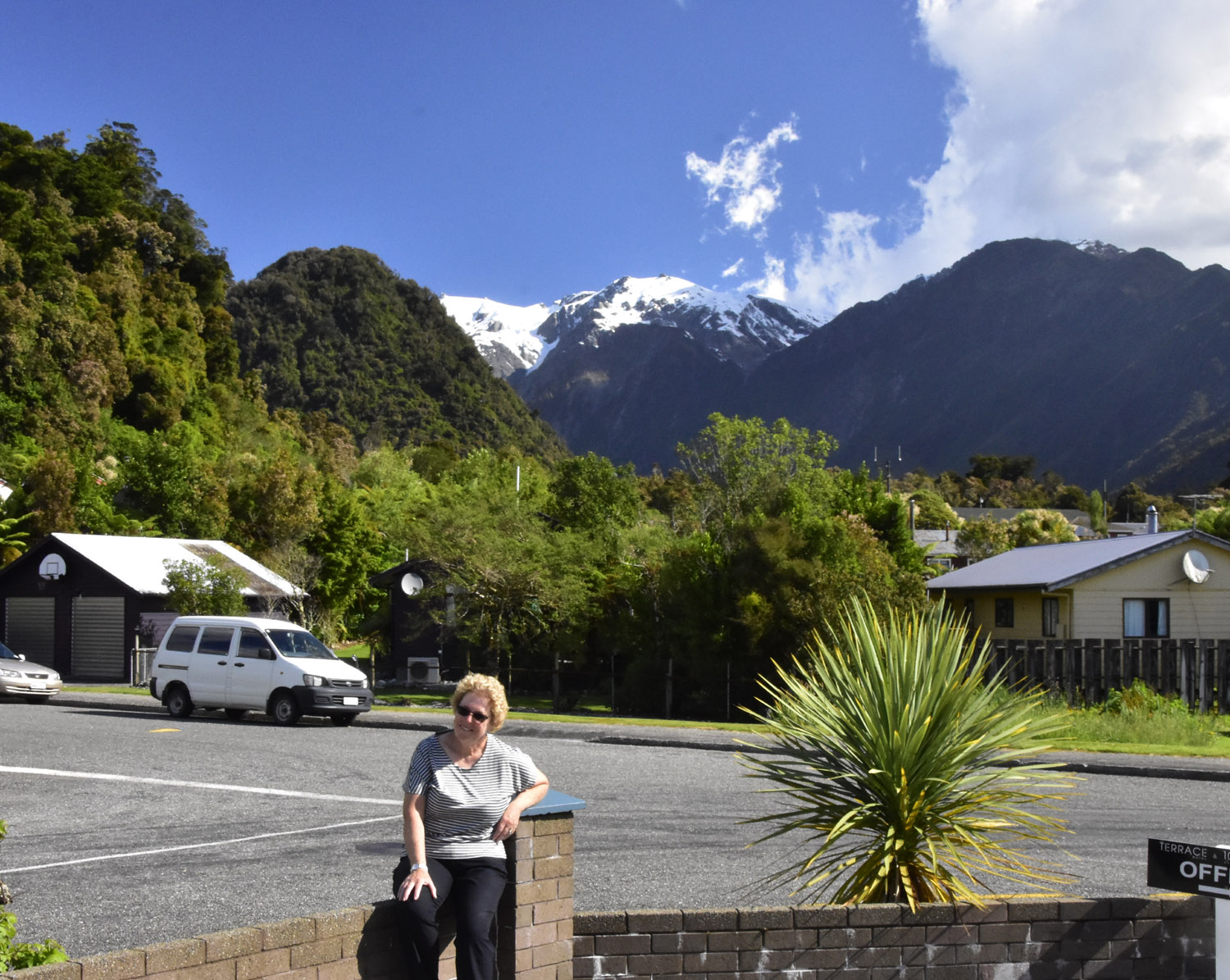 We finally arrived at the town of Franz Joseph close to the west coast in what is known as Glacier Country. The last photo below is Charlotte sitting outside our motel room with a view to die for – more on that later!