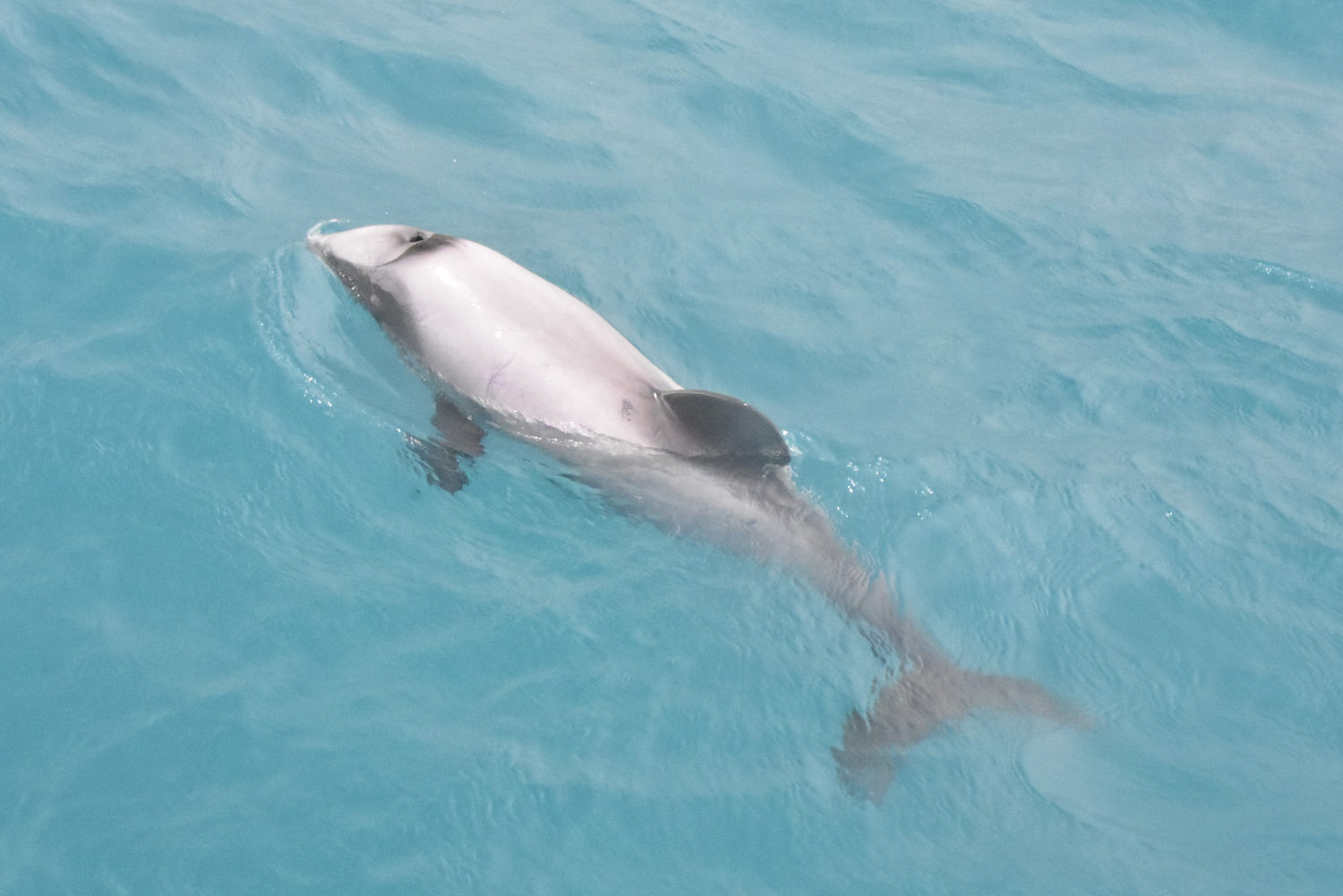 Hector’s dolphins are the smallest and rarest marine dolphins in the world and are only found around the inshore waters of the South Island of New Zealand, with Akaroa Harbour and Banks Peninsula hosting the highest population in one location. They are distinguishable by their rounded black dorsal fin, which is shaped like a Mickey Mouse ear. Their bodies are a distinctive grey colour, with white and black markings. They also have a short snout.