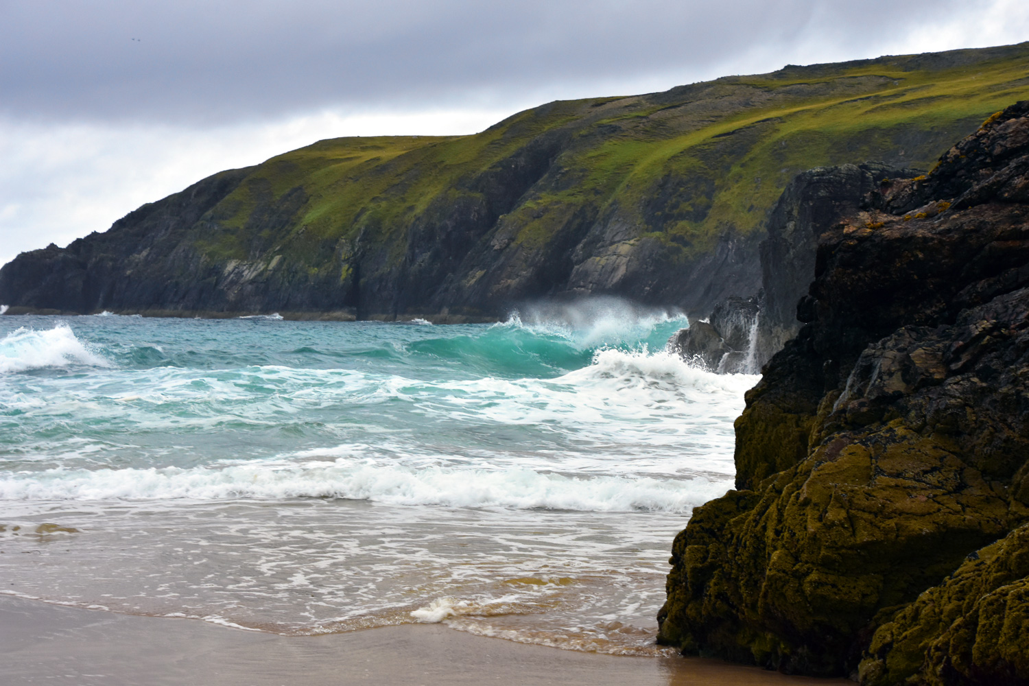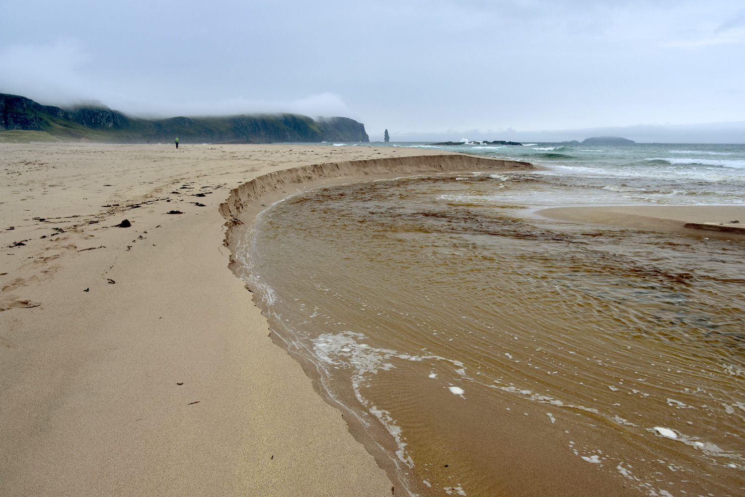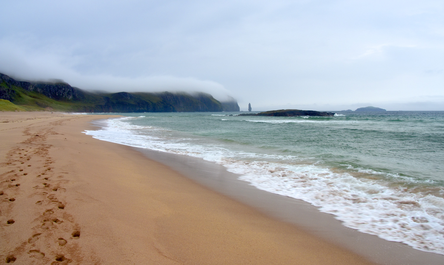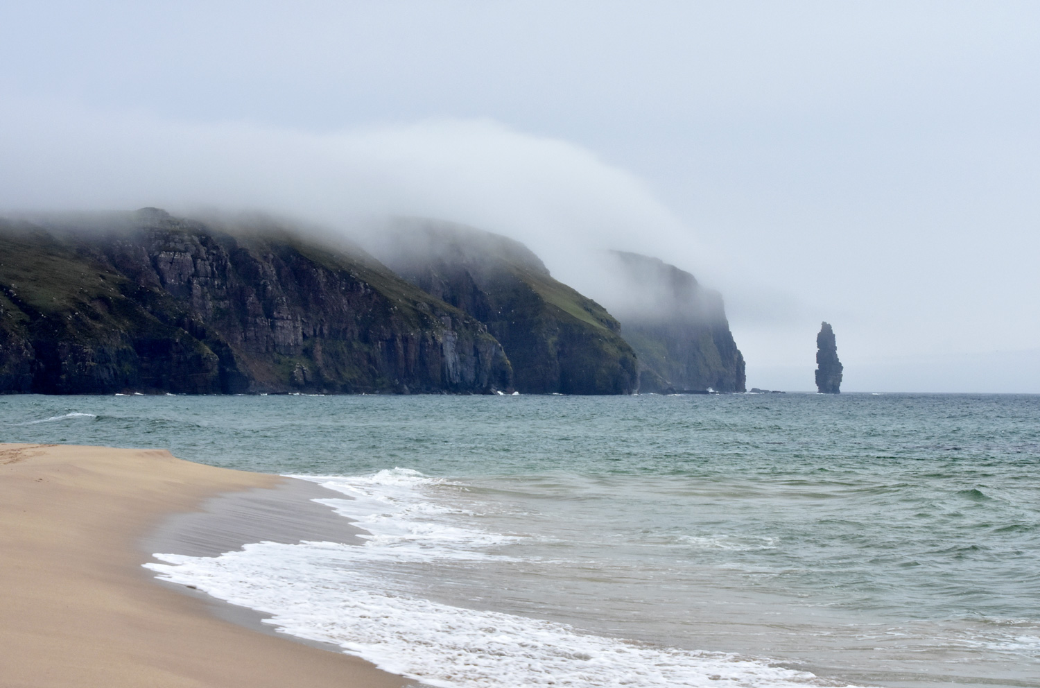 The sweeping sands of Sandwood Bay, with cloud rolling off the cliffs towards the Am Buachaille sea stack