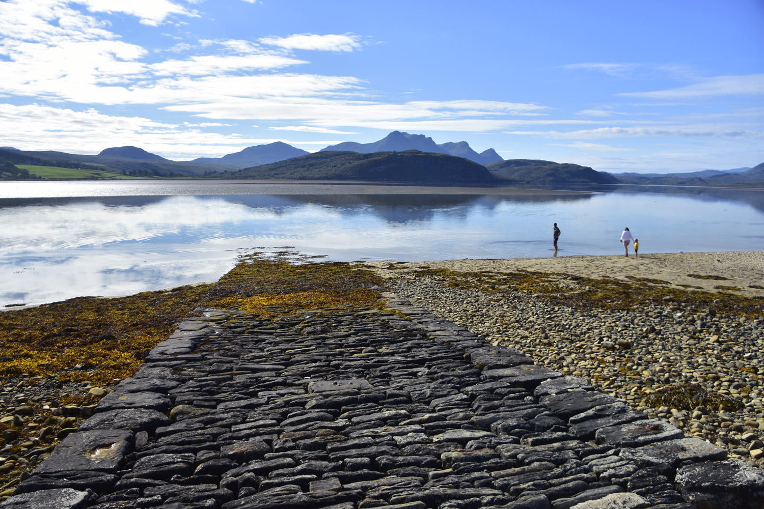 View from the mini beach on the causeway crossing the Kyle of Tongue, looking south to the 2,509 ft. Ben Loyal mountain in the distance – no cloud on the mountain today!
