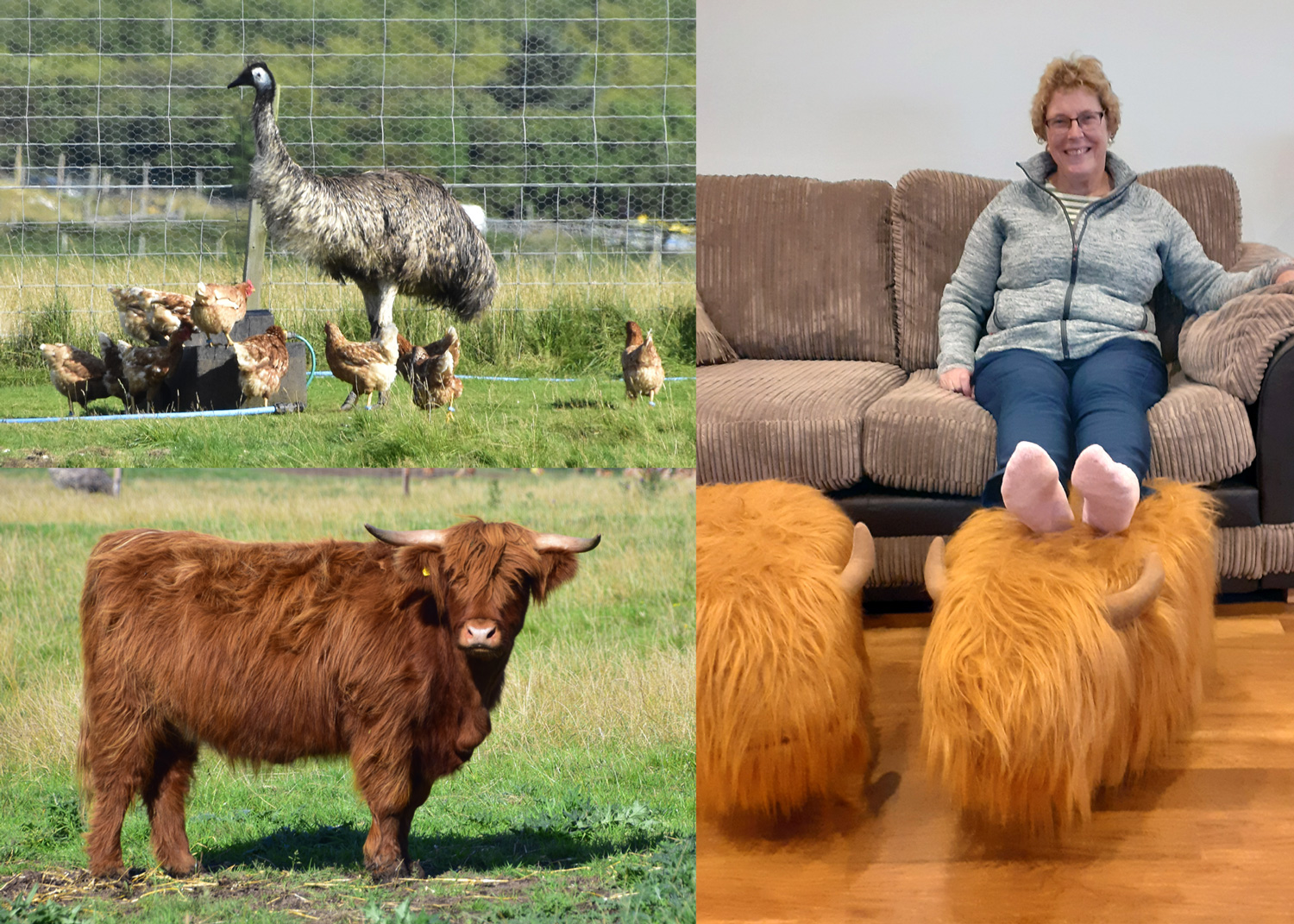 Chickens with their Emu protector, a lovely Highland Cow and our own Highland Cow footstools