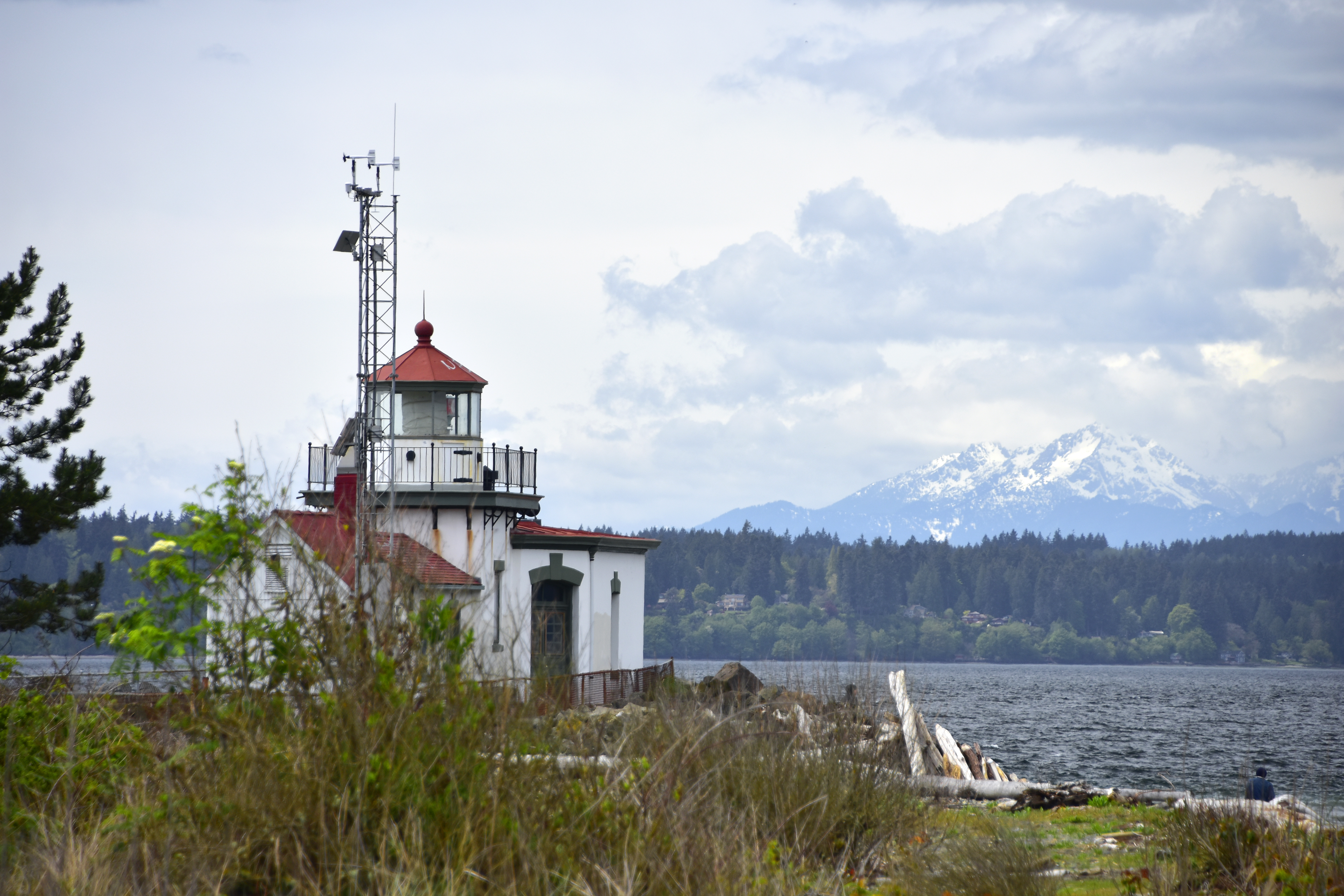 The West Point Lighthouse with the dramatic background of the Olympic Mountains