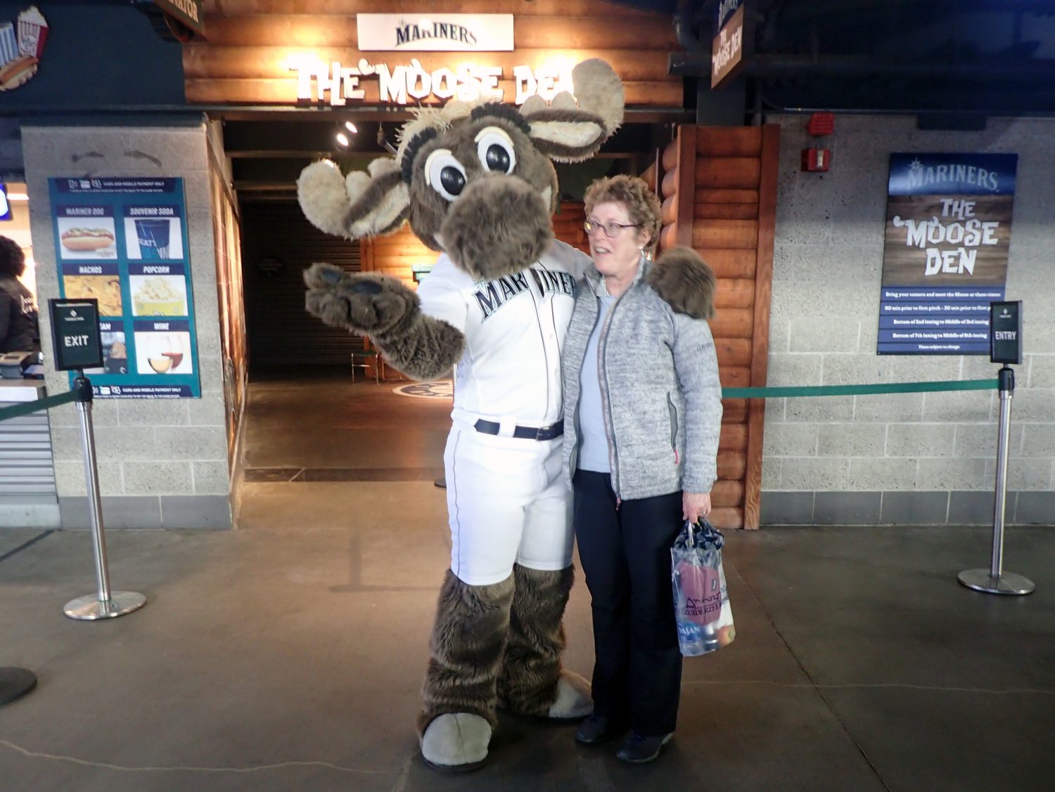 Charlotte is disappointed that she can’t fit Moose, the Mariner’s mascot, into her luggage!