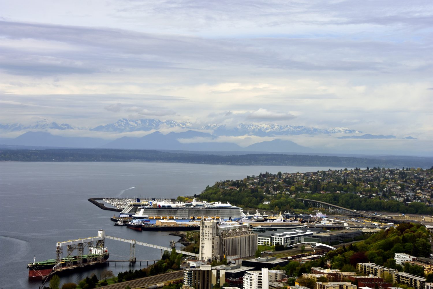 View across Puget Sound to the Olympic Mountains. Seattle is a popular stop for cruise ships, two of which are docked, and many Alaskan cruises start from here.