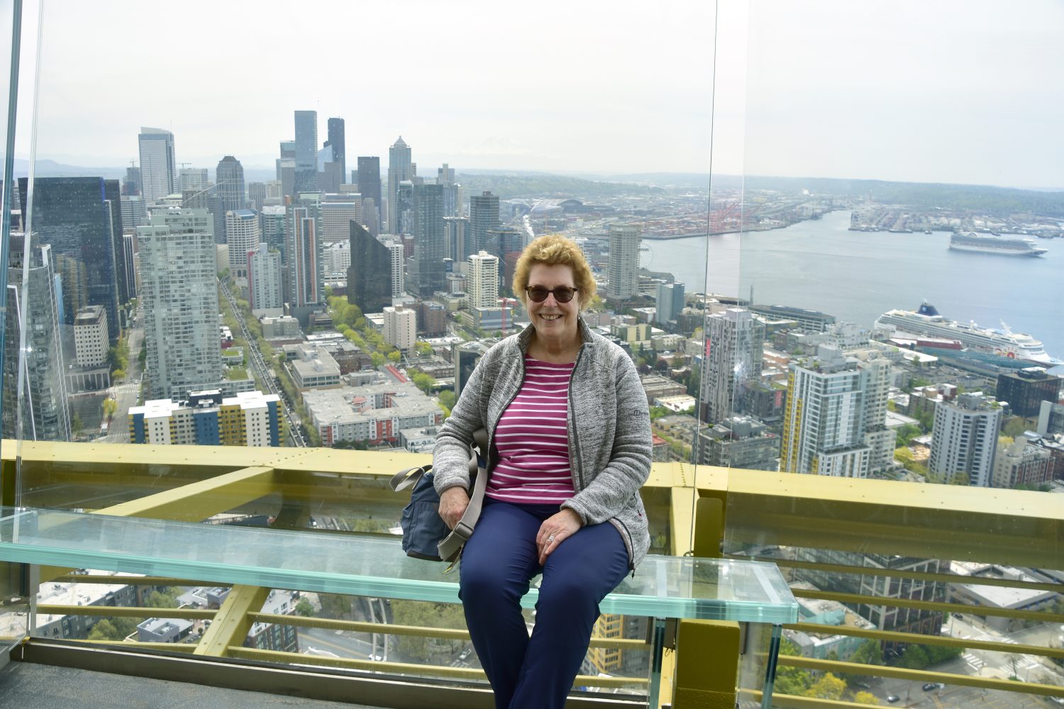 Eleven foot tall sloping glass walls and glass benches provide unobstructed views of Seattle from the observation deck. The view shows the city skyline next to Lake Washington and Charlotte enjoying a rest!