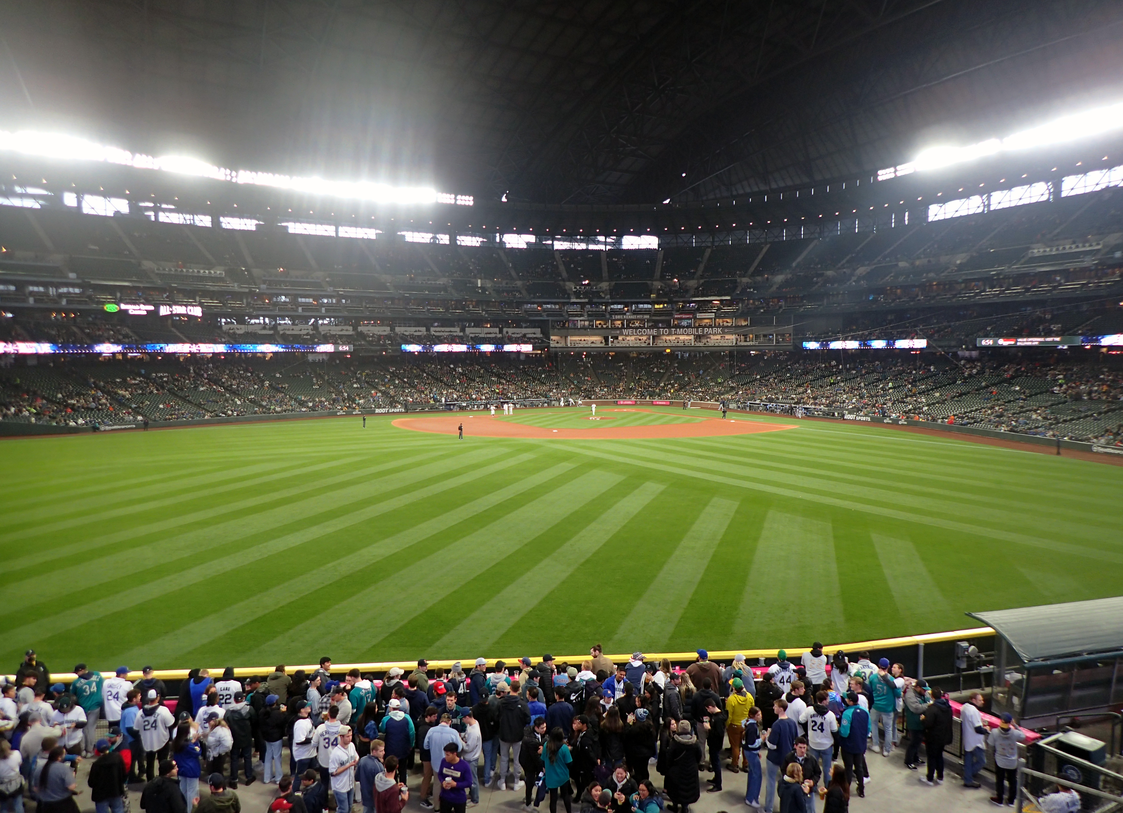 The T-Mobile Park stadium with its retractable roof closed to protect the players and fans from the rain