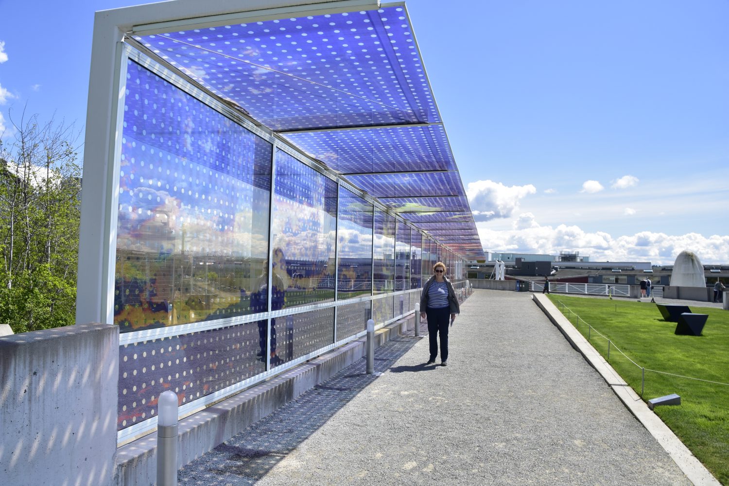 Seattle Cloud Cover – Charlotte walks along the glass bridge, which invites viewers to take cover and to look down to the railroad below through images of changing skies. It is made from saturated colour photographs, sandwiched in glass.