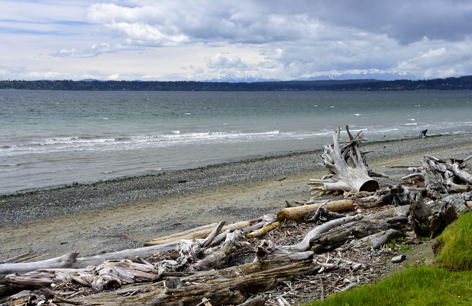Driftwood is strewn across many of the beaches, creating an interesting foreground to the waters of Puget Sound and the Olympic mountain range.