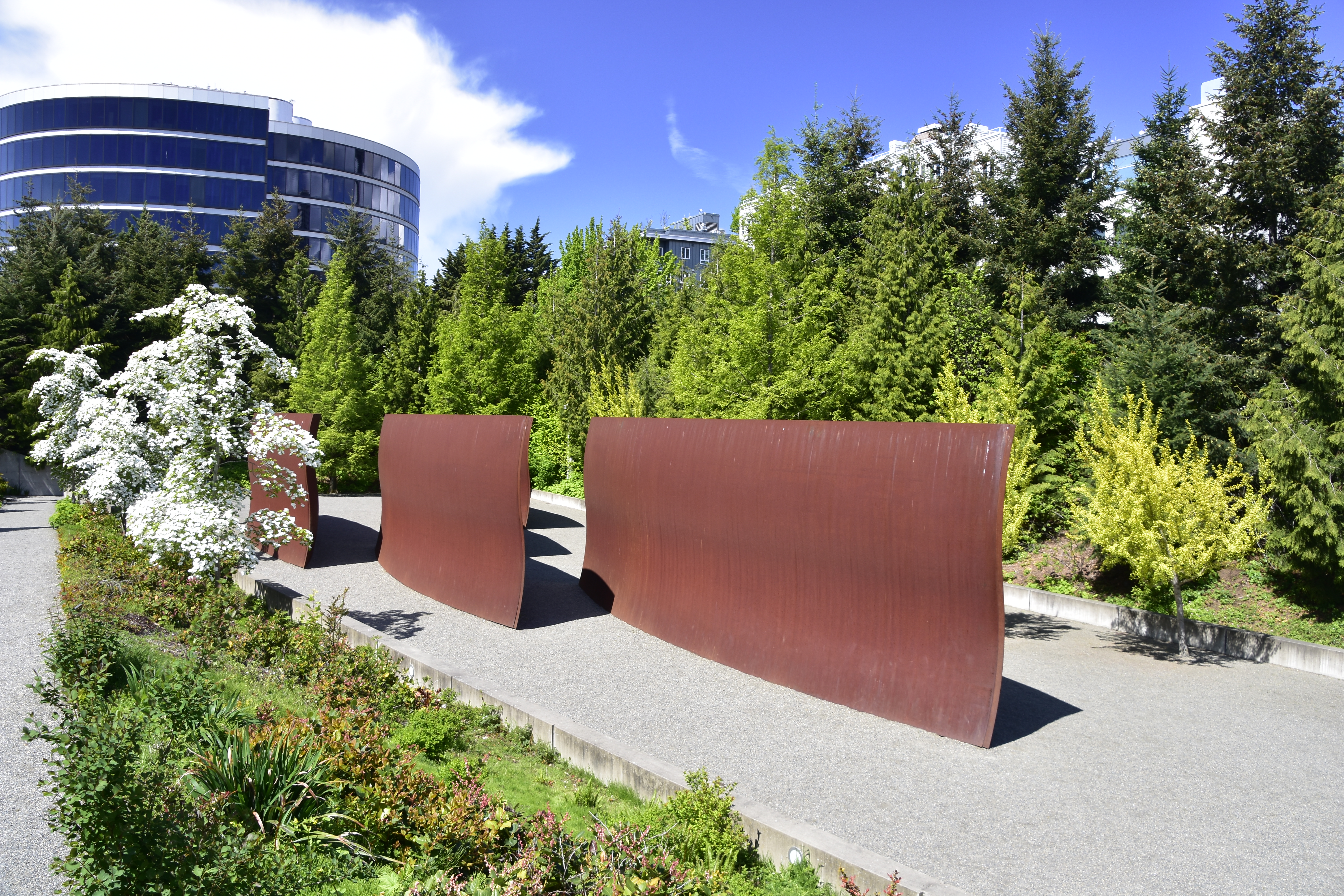 Wake – The Sculpture is composed of five identical towering, curved-steel forms, each with paired S shapes – gently curving serpentines of convex and concave sections suggesting tidal waves or profiles of battleships.