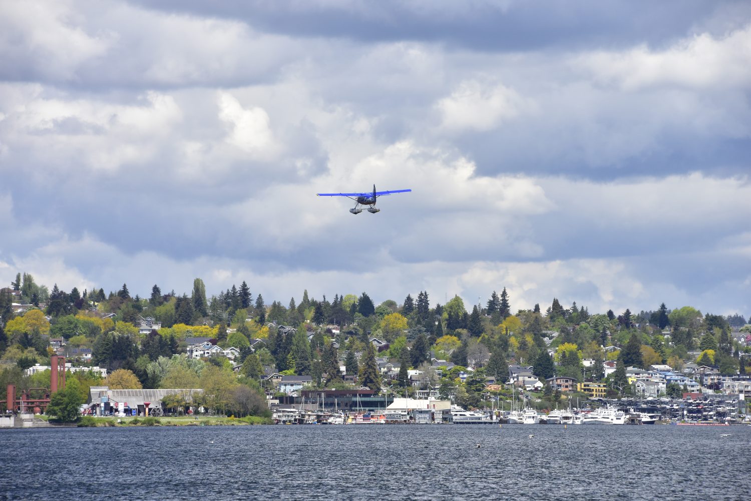 A float plane taking off from Lake Union and heading north over Gas Works Park