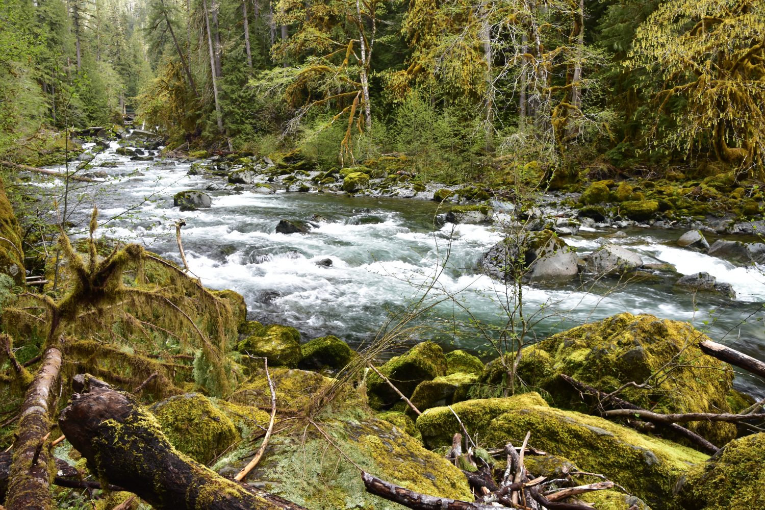 Staircase Rapids is a 2-mile circular hike following the North Fork of the Skokomish River, with spectacular views of fast moving rapids. The river runs through temperate rain forest with bright green and yellow moss growing on trees and rocks providing a vibrant backdrop to the rapids.