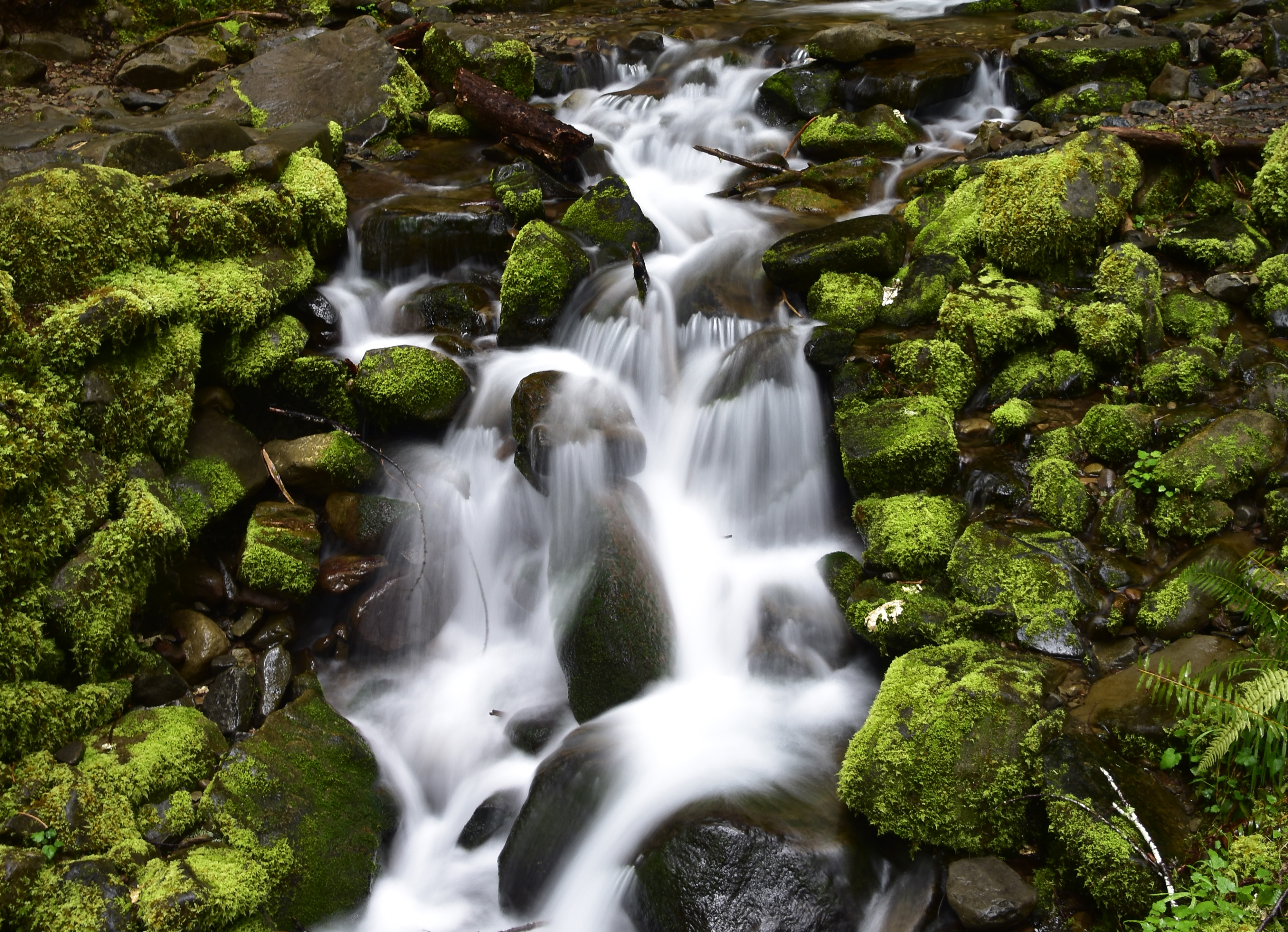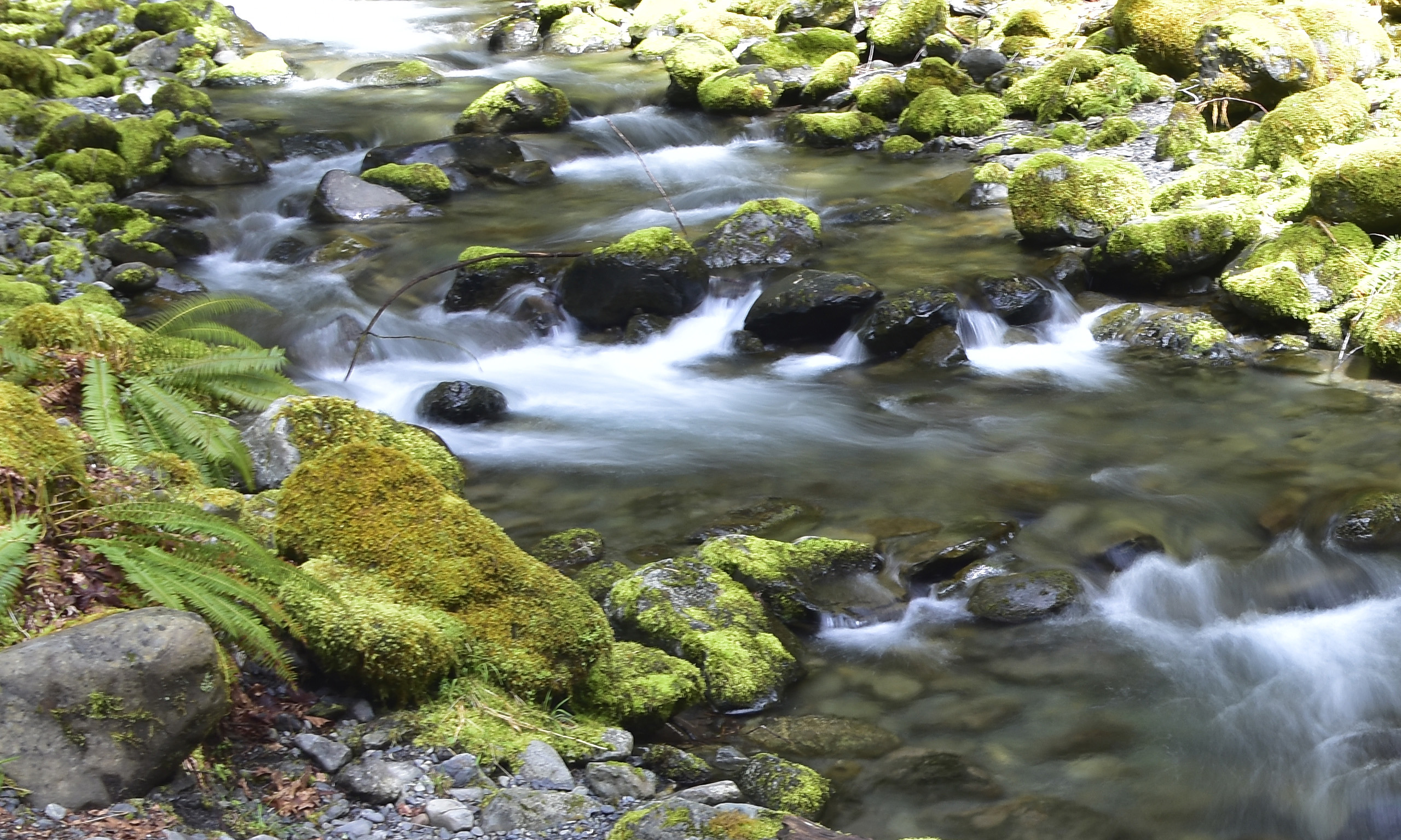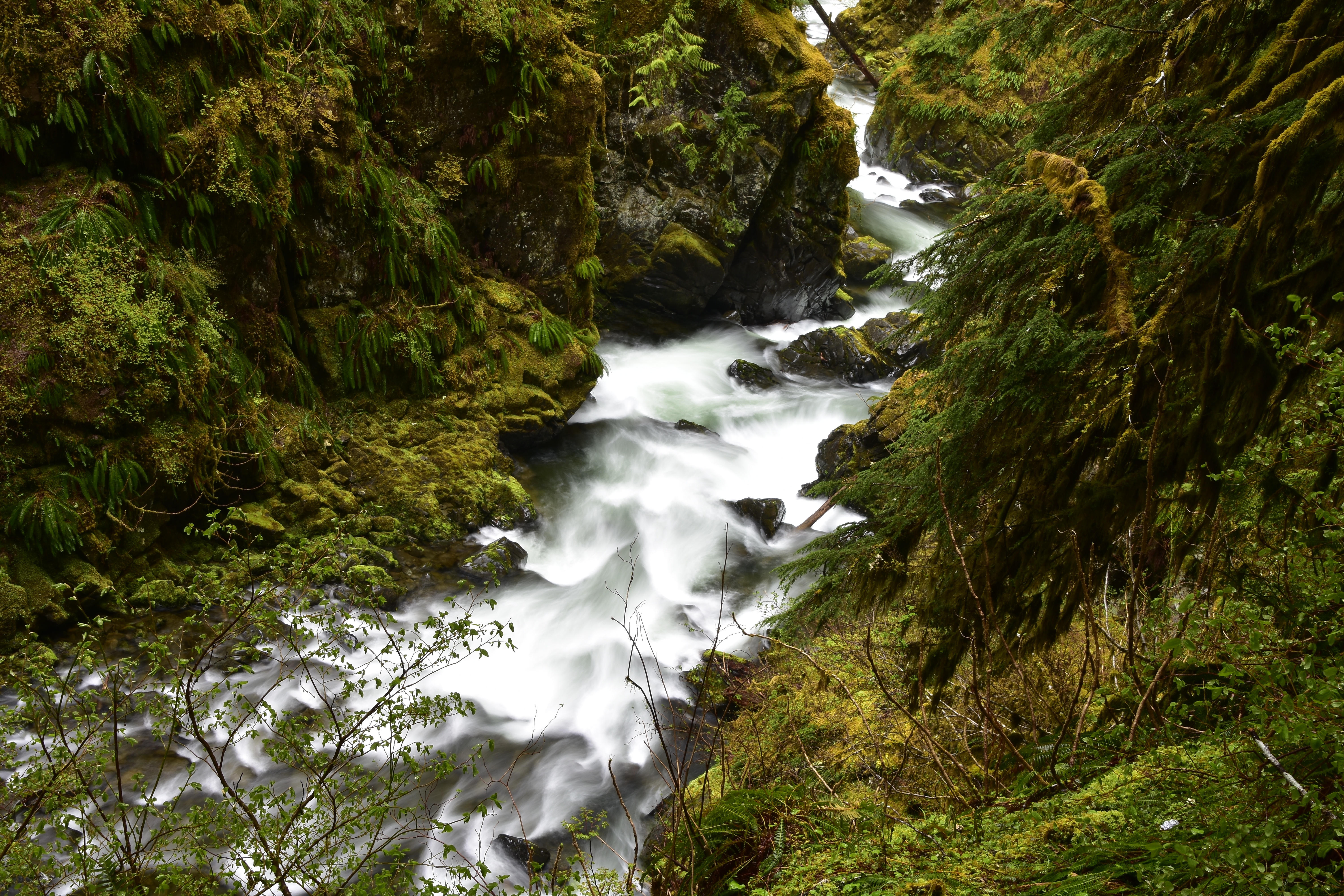 Staircase Rapids is a 2-mile circular hike following the North Fork of the Skokomish River, with spectacular views of fast moving rapids. The river runs through temperate rain forest with bright green and yellow moss growing on trees and rocks providing a vibrant backdrop to the rapids.