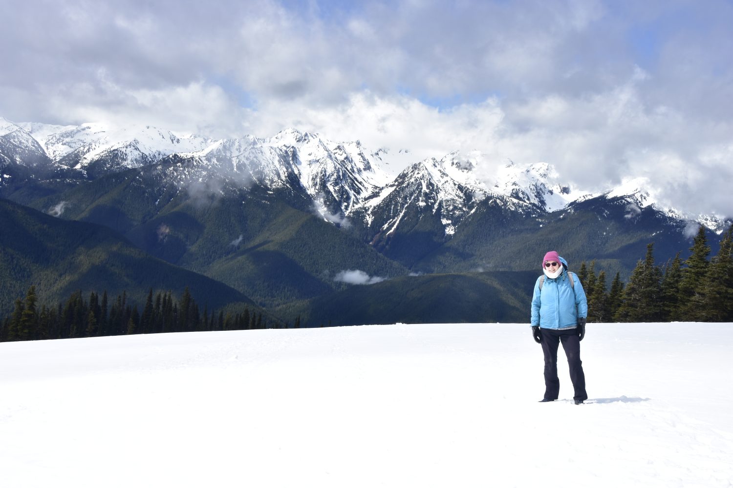 Charlotte enjoying the pristine snow; 10” had fallen a couple of nights before. The majestic Olympic Mountains dominate the skyline.