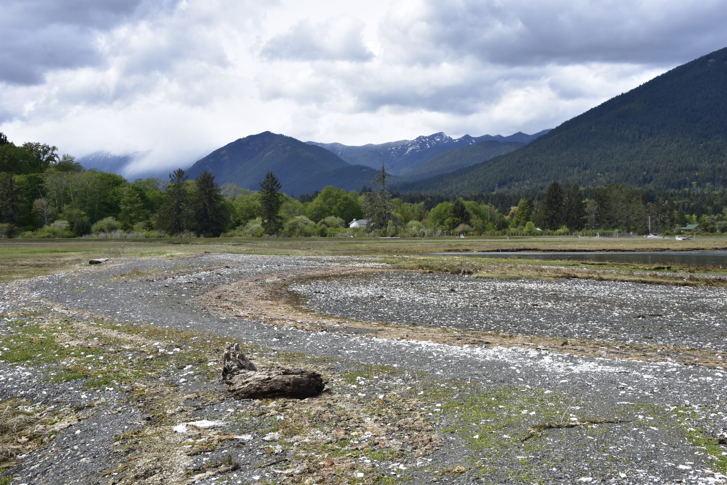 Dosewallips River Delta is an estuary into the Hood Canal. It is where freshwater from the river enters the saltwater of the sea. At this point the delta forms a rich environment of mudflats, eelgrass beds and salt marshes laced with brackish streams.