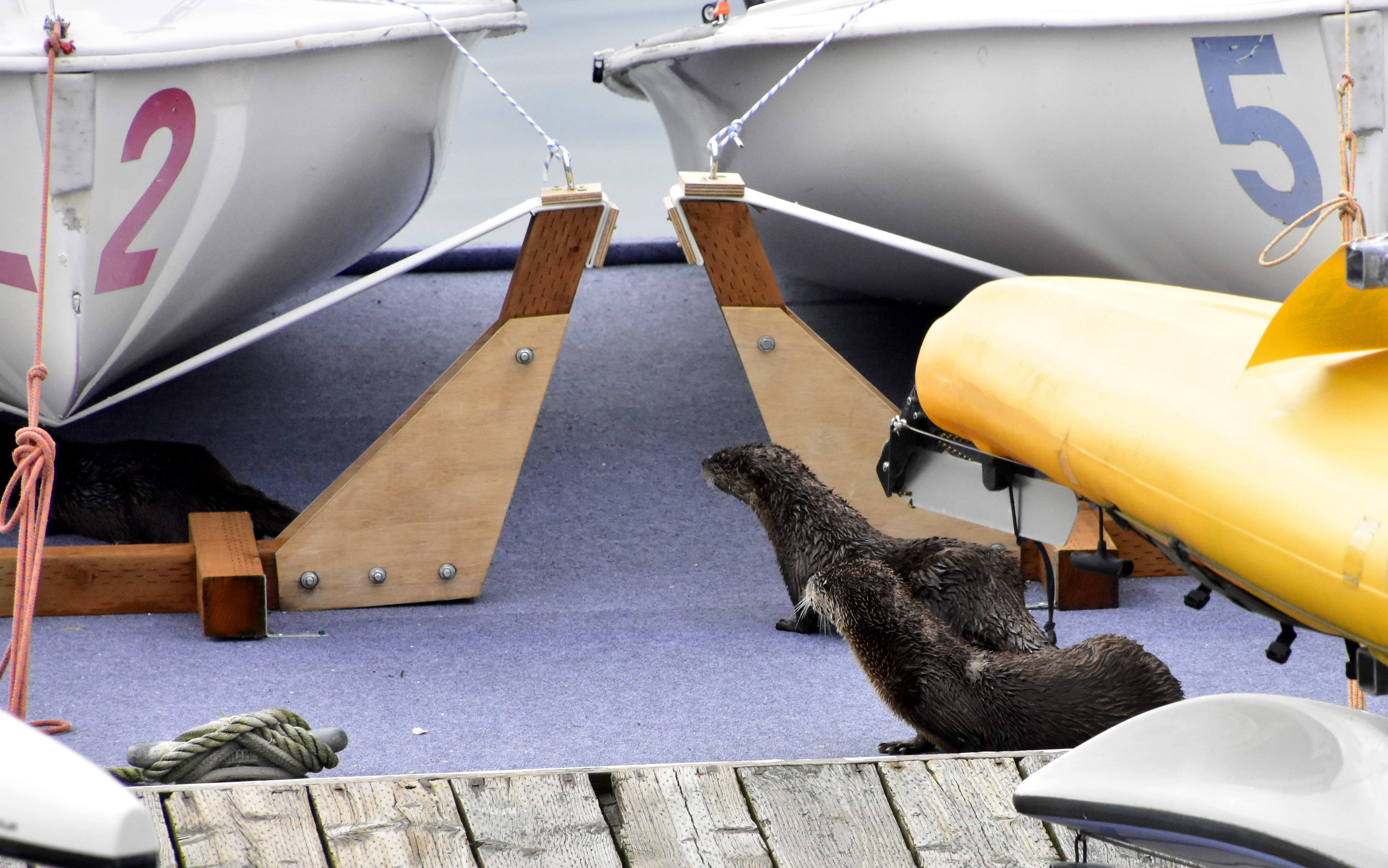 A group of Sea Otters playing amongst the boats in the Marina.
