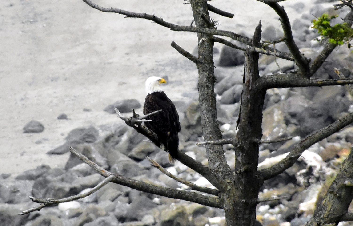 Bald Eagles are present year round in Washington State. This beautiful bird is perched in a tree overlooking the beach near Point Wilson Lighthouse.