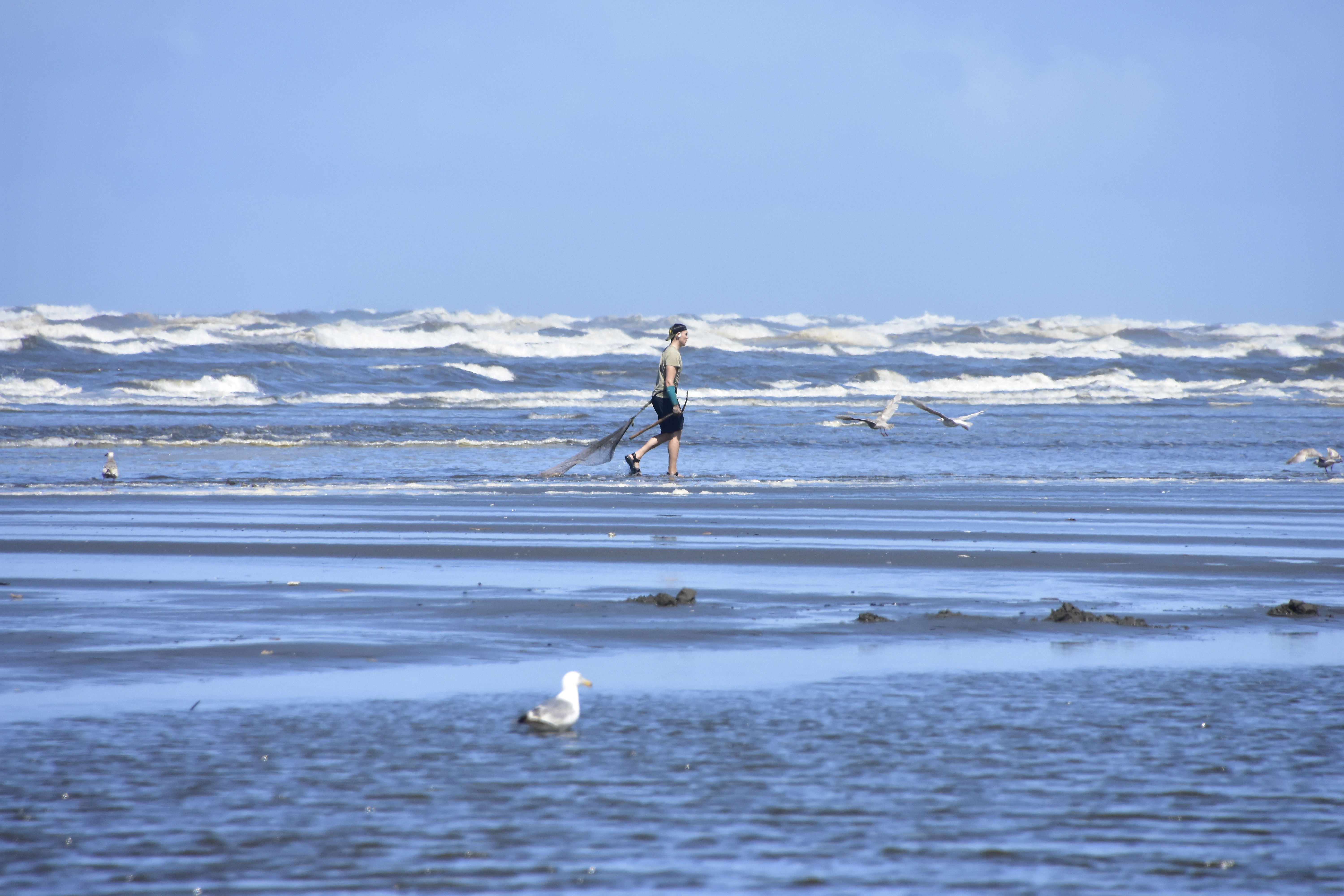 When we walked down onto the beach we noticed a crowd of people and vehicles in the distance. Charlotte went over and harangued a couple of lads and asked them what they were doing. They were fisherman digging for Razor Clams. These fishermen are allowed to use the beach for harvesting Razor Clams for a few months a year, on specific days for about 4 hours at a time. The experienced fishermen know where to dig, using tell-tale signs left by the clams. They then sell the clams on the beach that day.