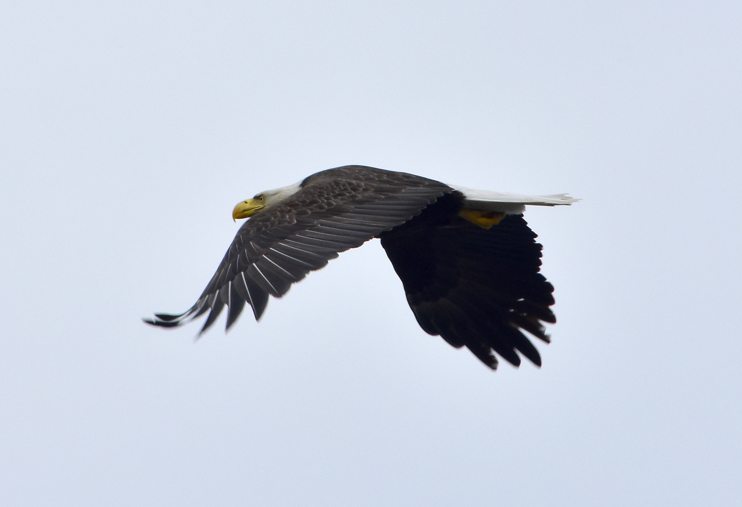 Keeping on the theme of birds of prey, we spotted a pair of Bald Eagles flying above the trees along the coastline. Suddenly one of them flew across the beach above us…..