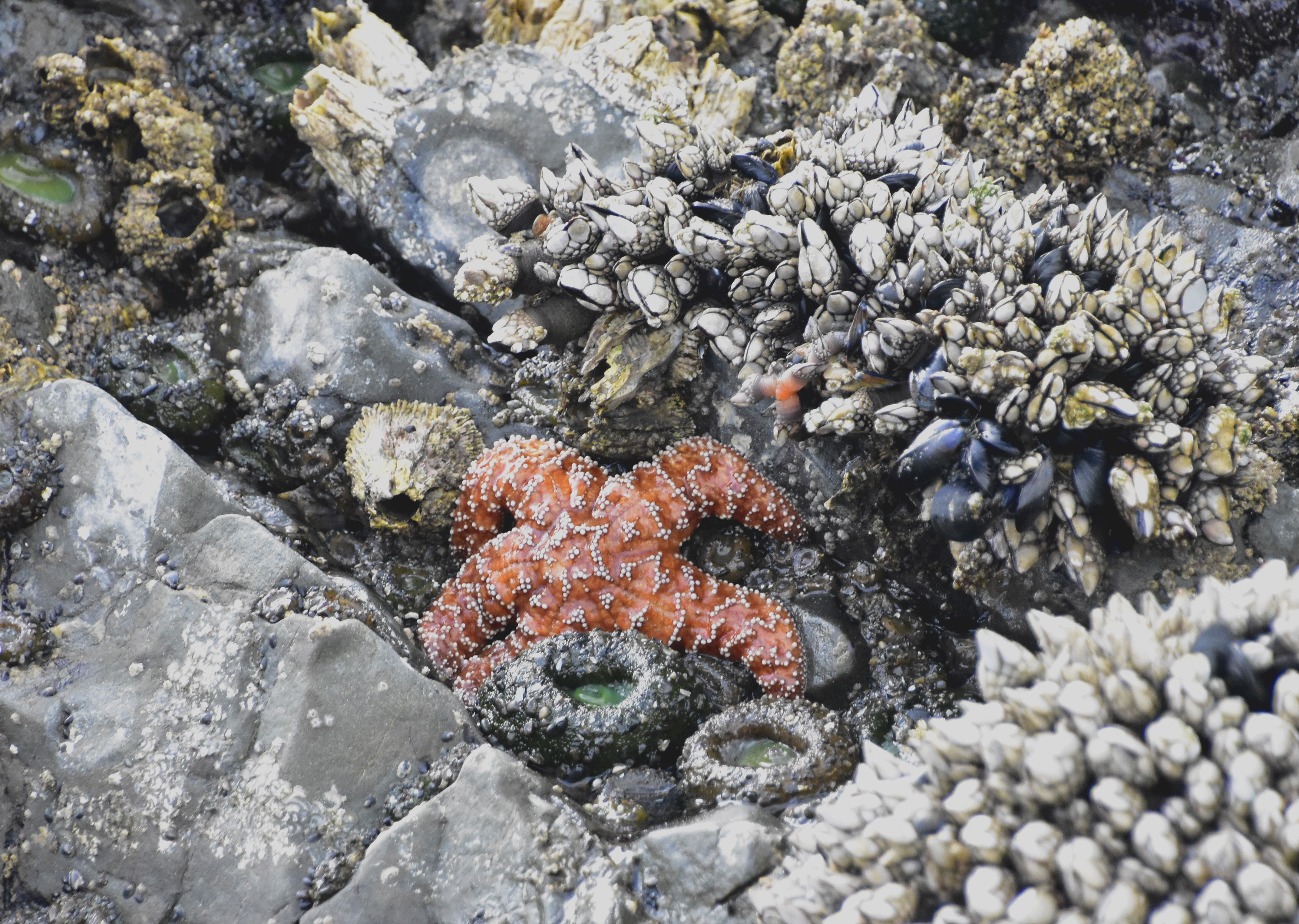 An orange starfish, with some giant green anemones and groups of barnacles.