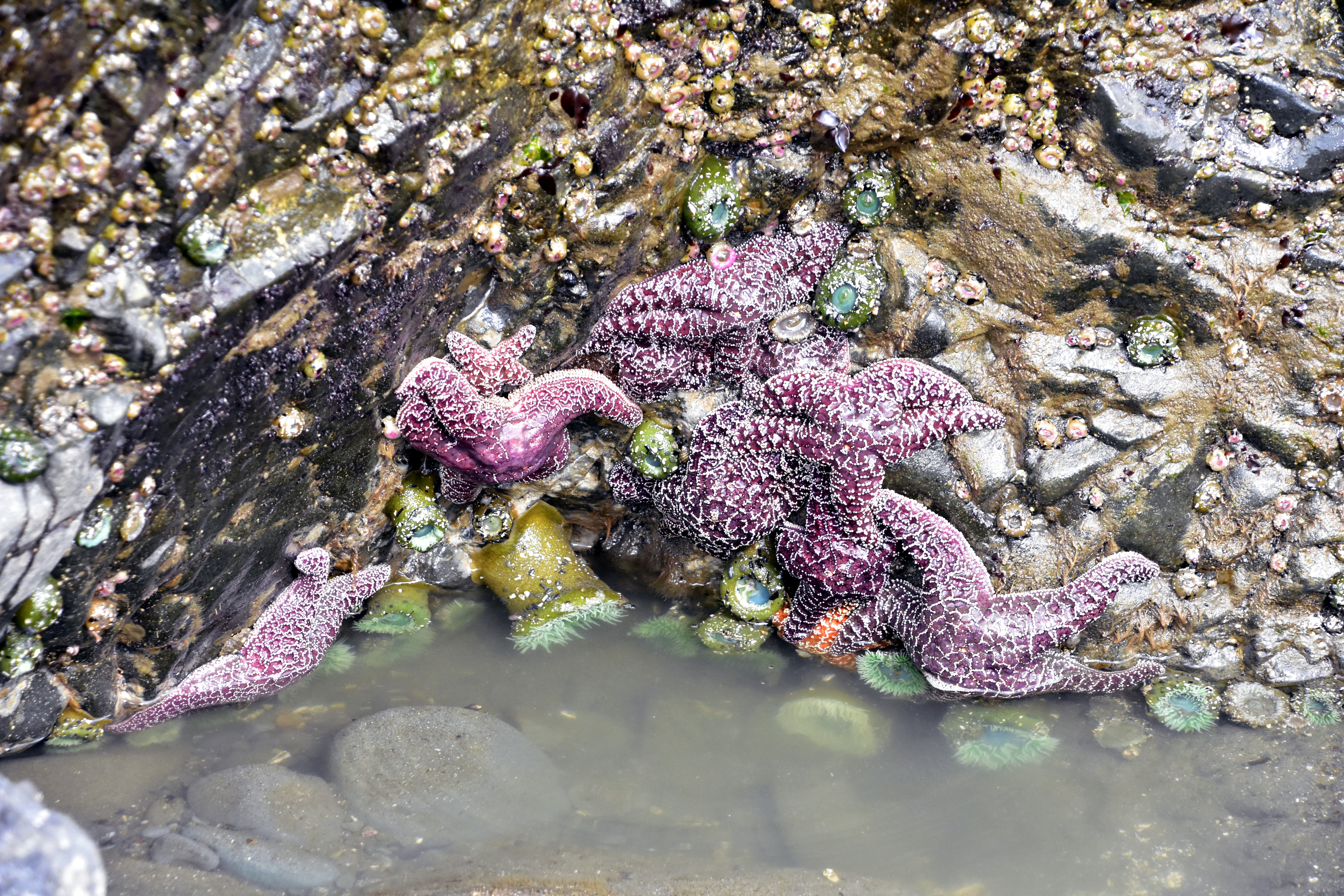 A group of purple starfish, which are common among the waters of the Pacific Ocean, together with giant green anemones.