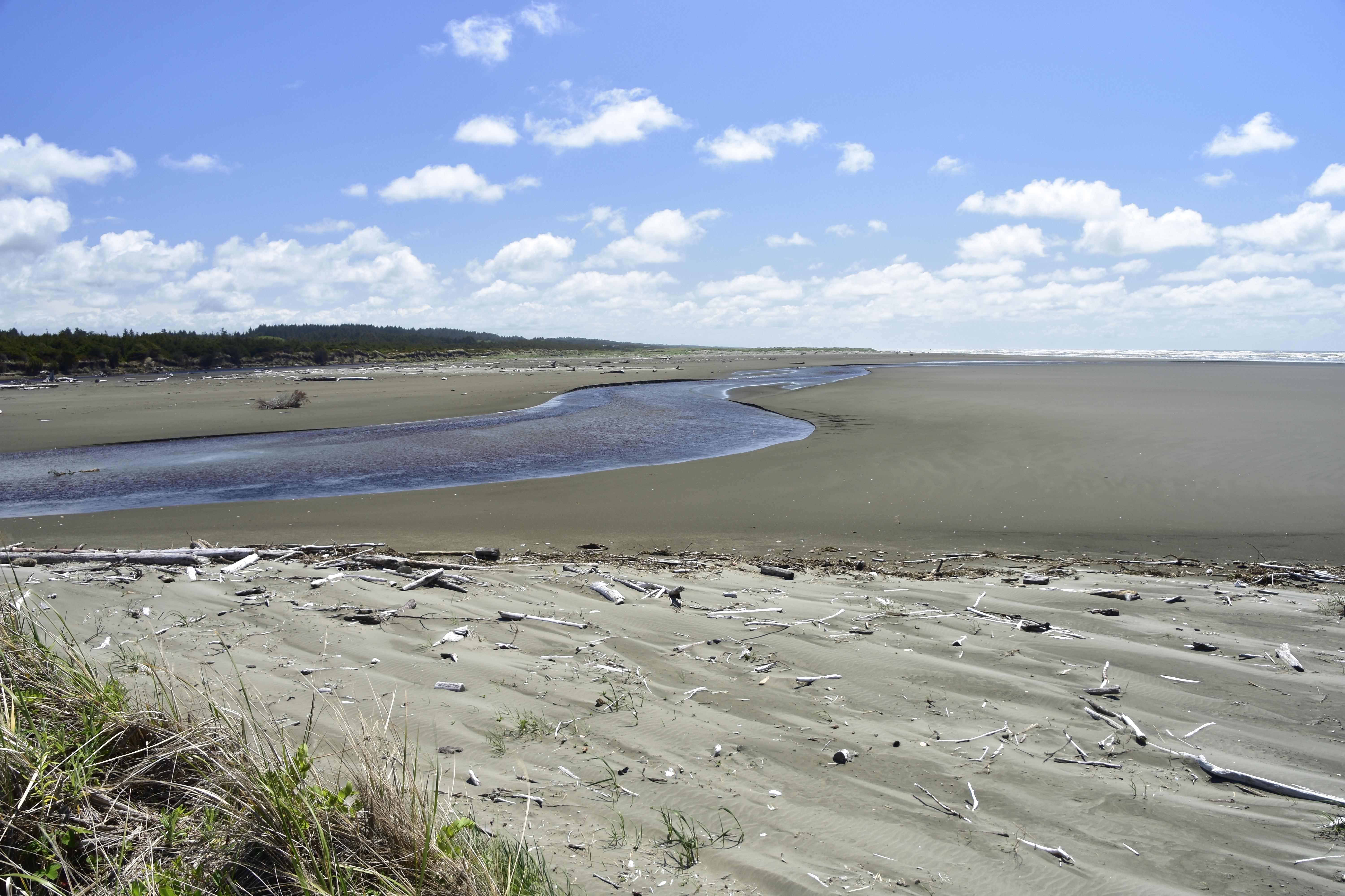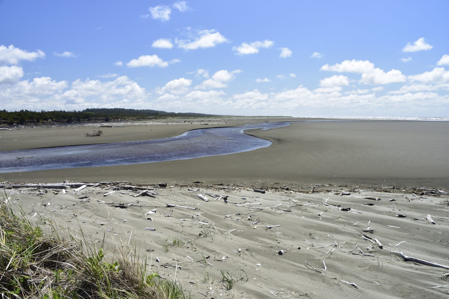 The River Copalis winds its way down to the sea. The crashing waves of the Pacific can be seen on the horizon.