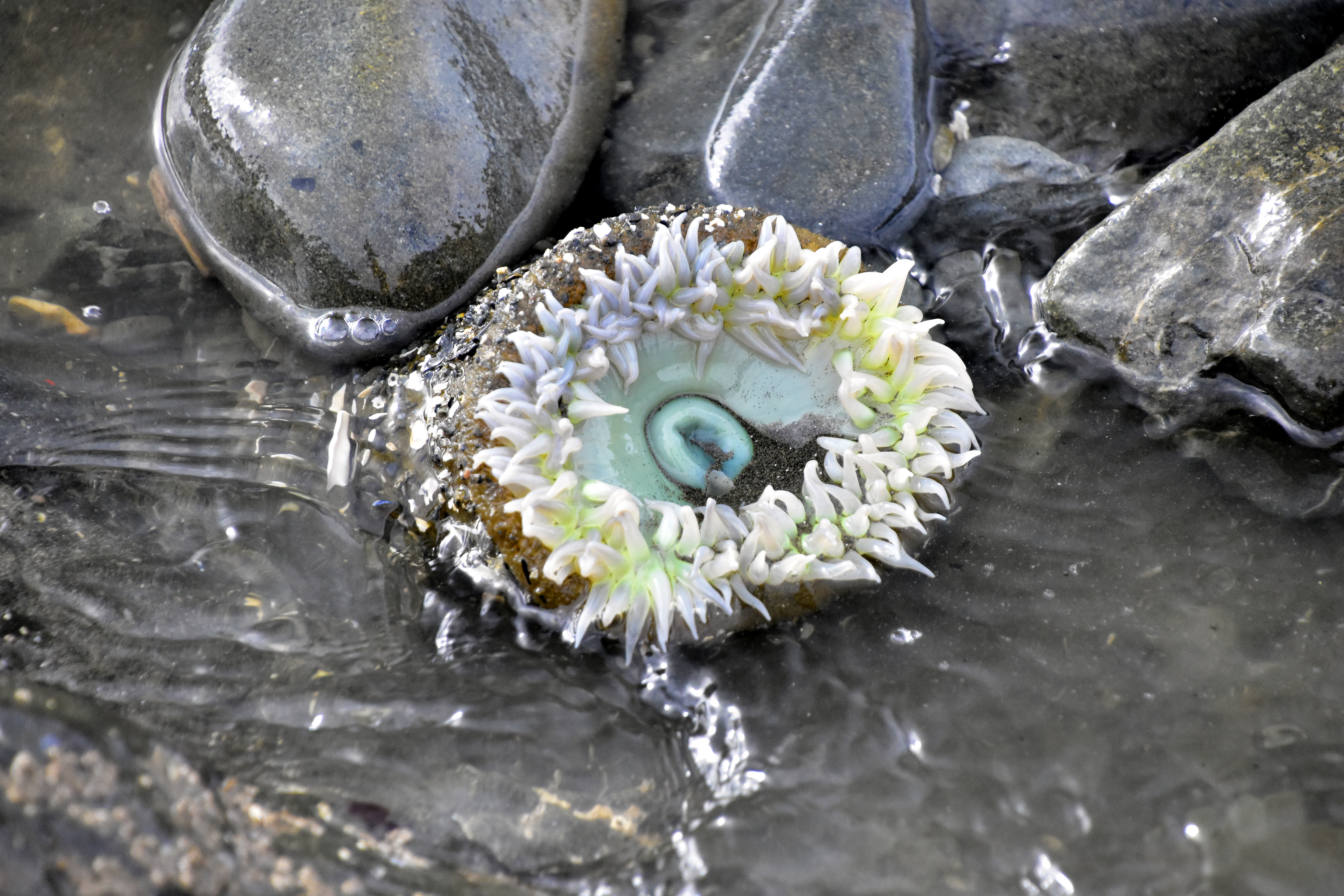 The receding tide revealed rock pools with brightly coloured star fish and anemones.