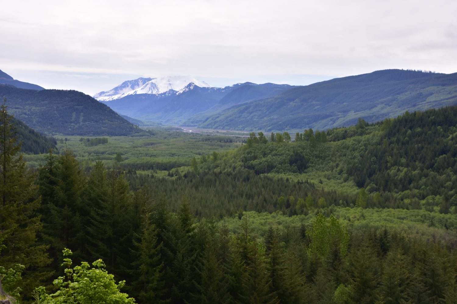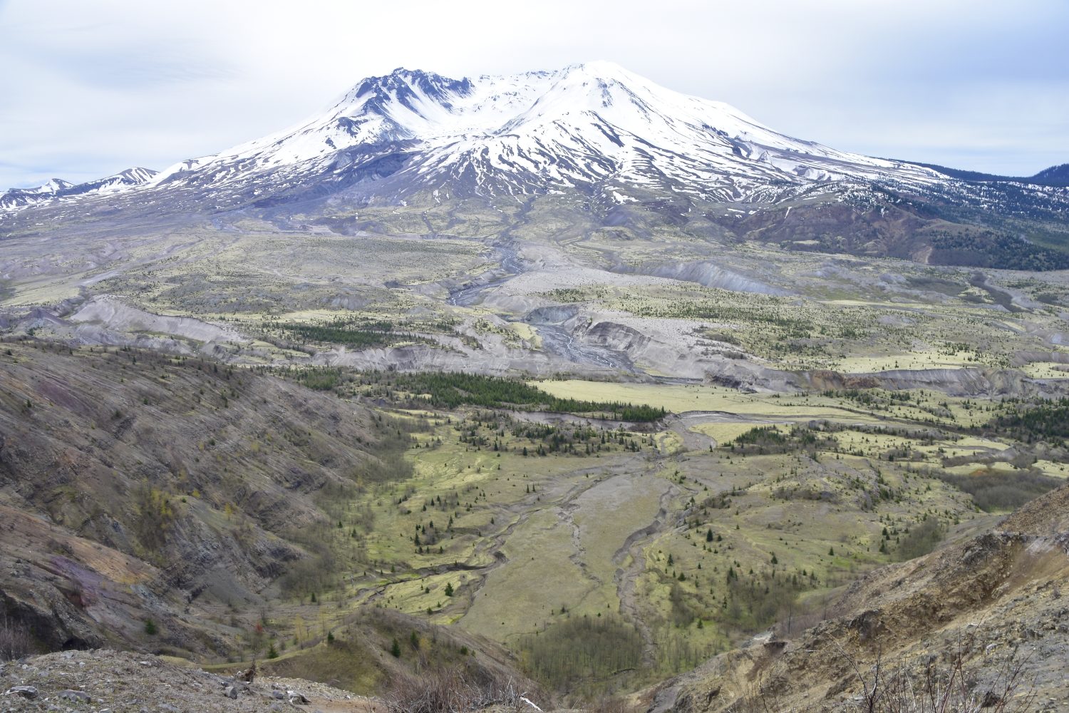 Fifteen miles down the valley from Mt. St. Helens marks the edge of the debris flow from the 1980 landslide that removed the north flank of the volcano, which can now clearly be seen.