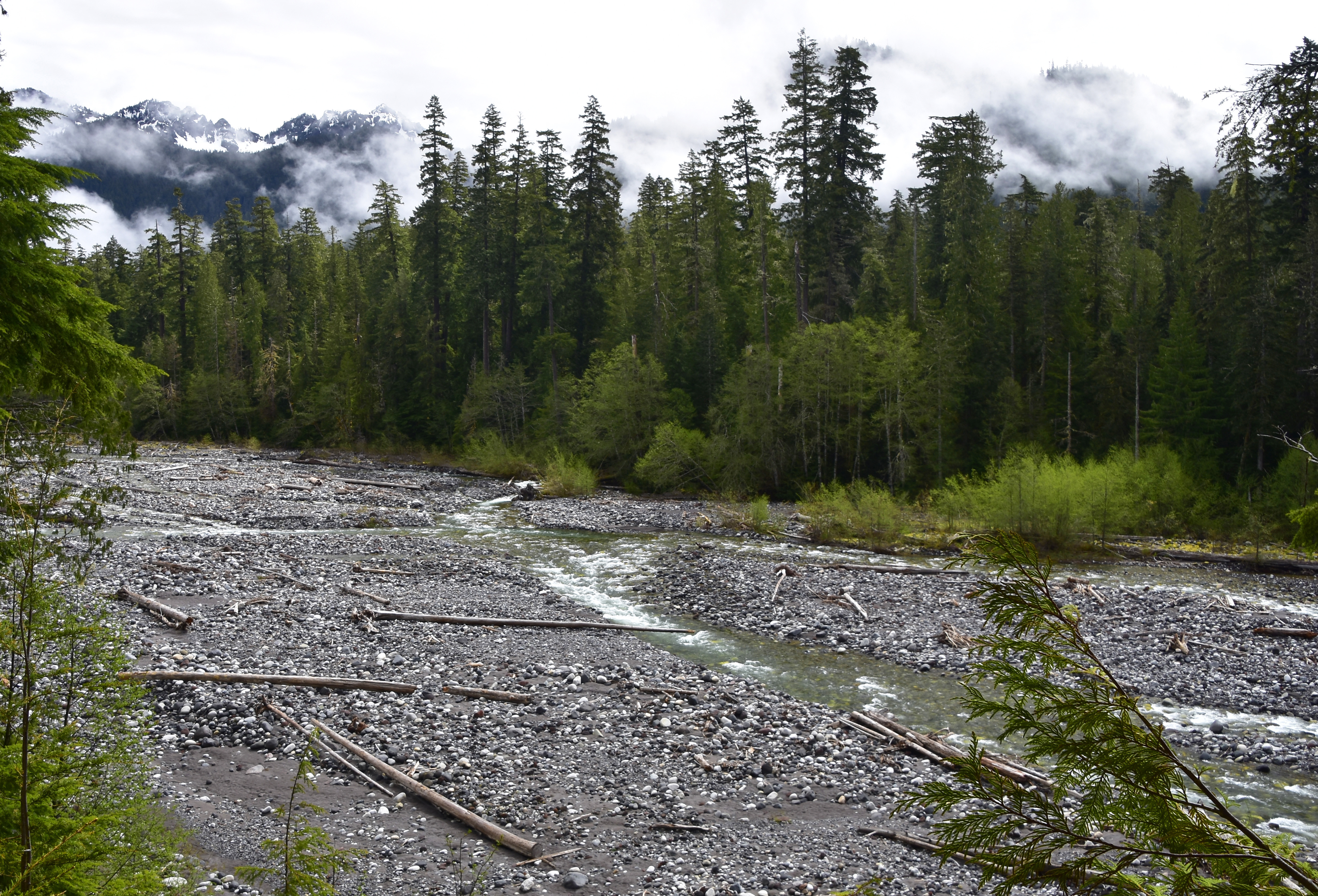 Early morning in the Nisqually River valley with low cloud shrouding the Cascade Mountains.