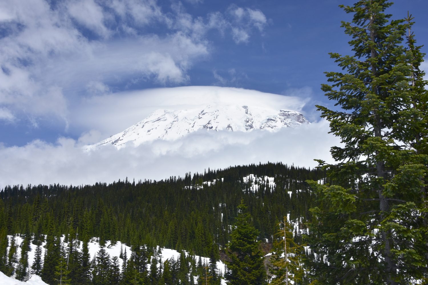 Mt. Rainier finally starts to reveal itself from within its micro-climate.
