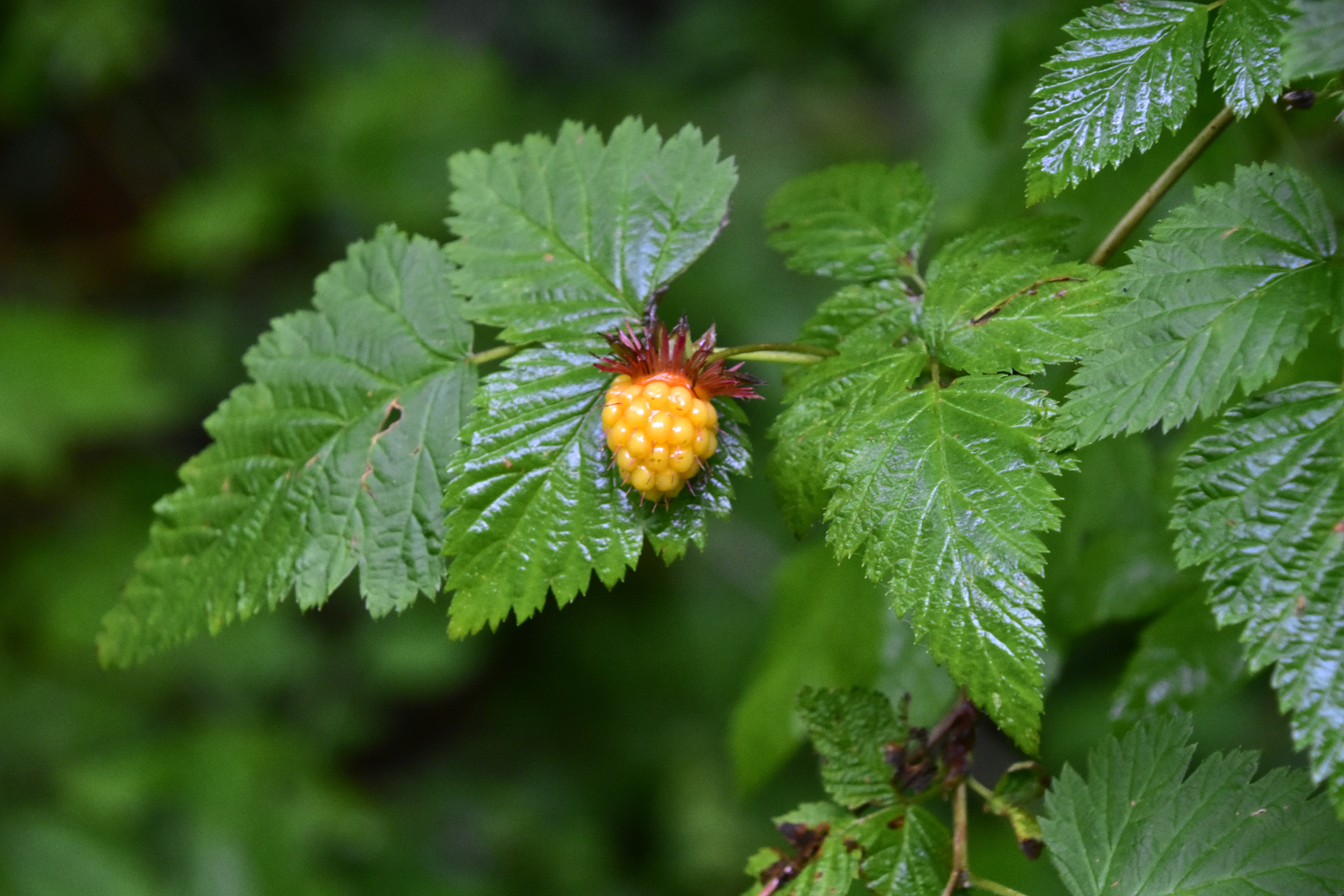 A nearly ripe Salmon Berry. A favourite of Brown Bears, these berries are a pinky-orange colour when fully ripe.