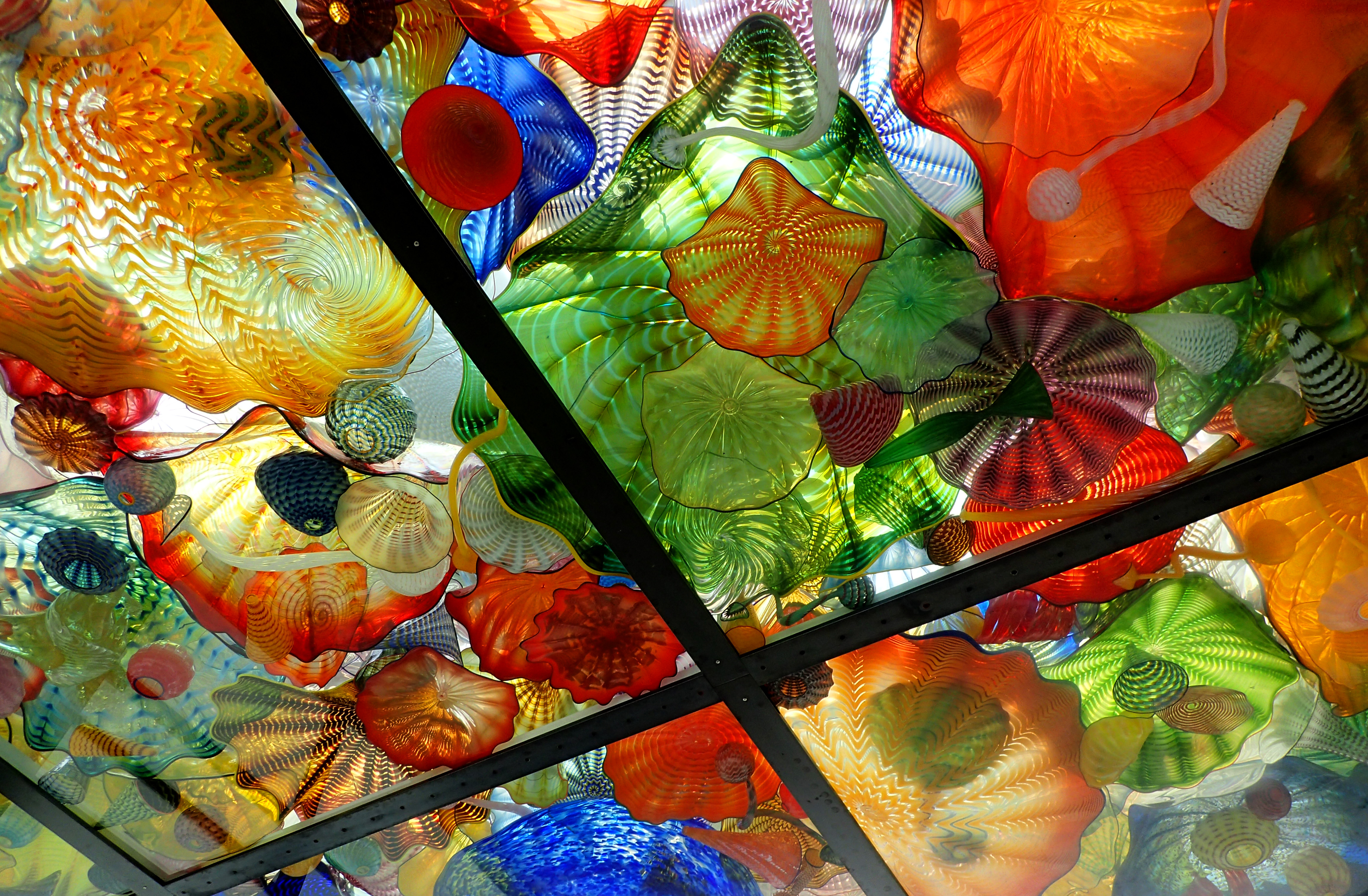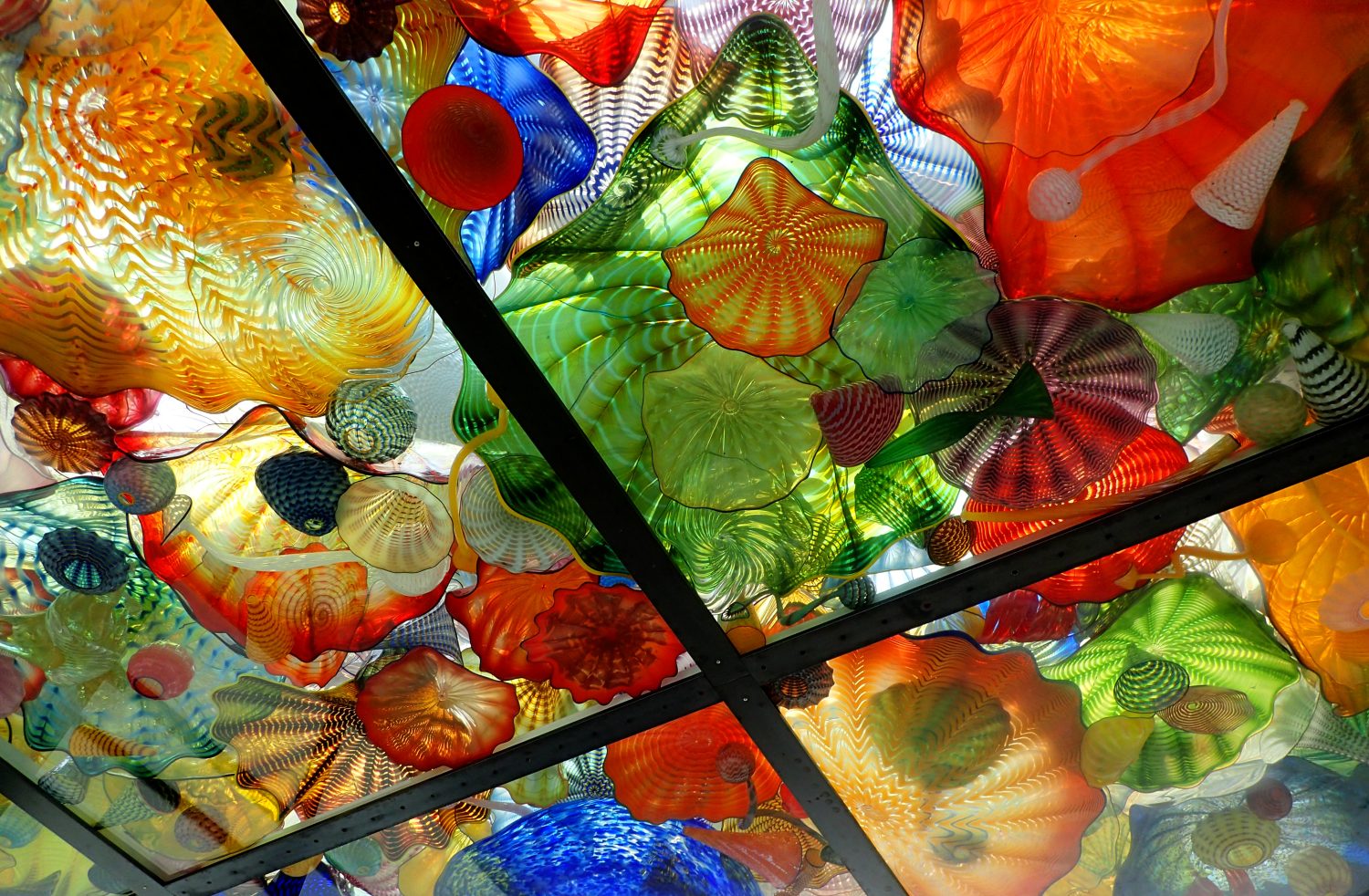 Seaform Pavilion: a glass ceiling and canopy system on the bridge showcasing 2,364 works of Chihuly glass from his Seaform and Persian series.
