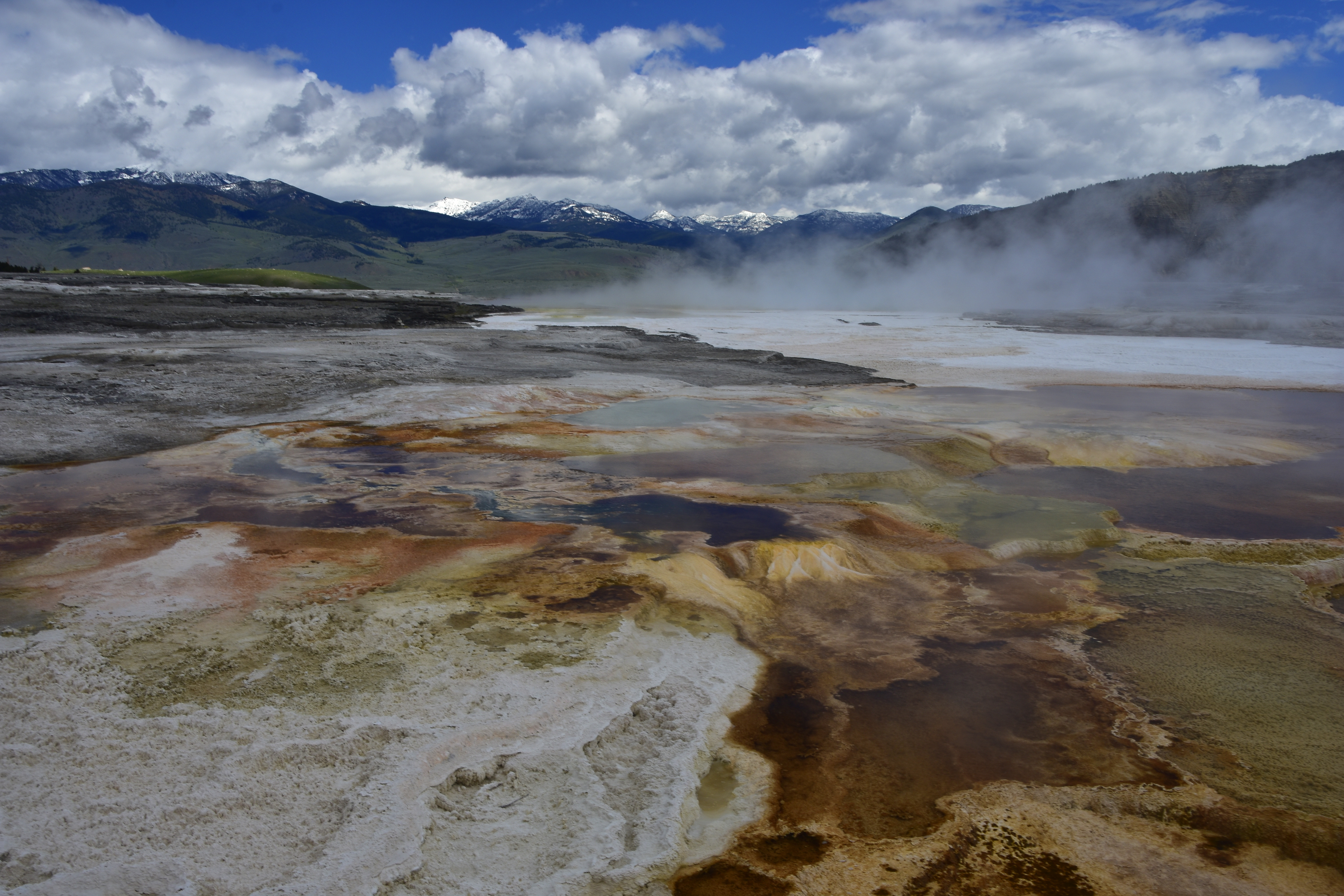 Mammoth Hot Springs Terraces overlooked by the Gallatin Mountain Range.