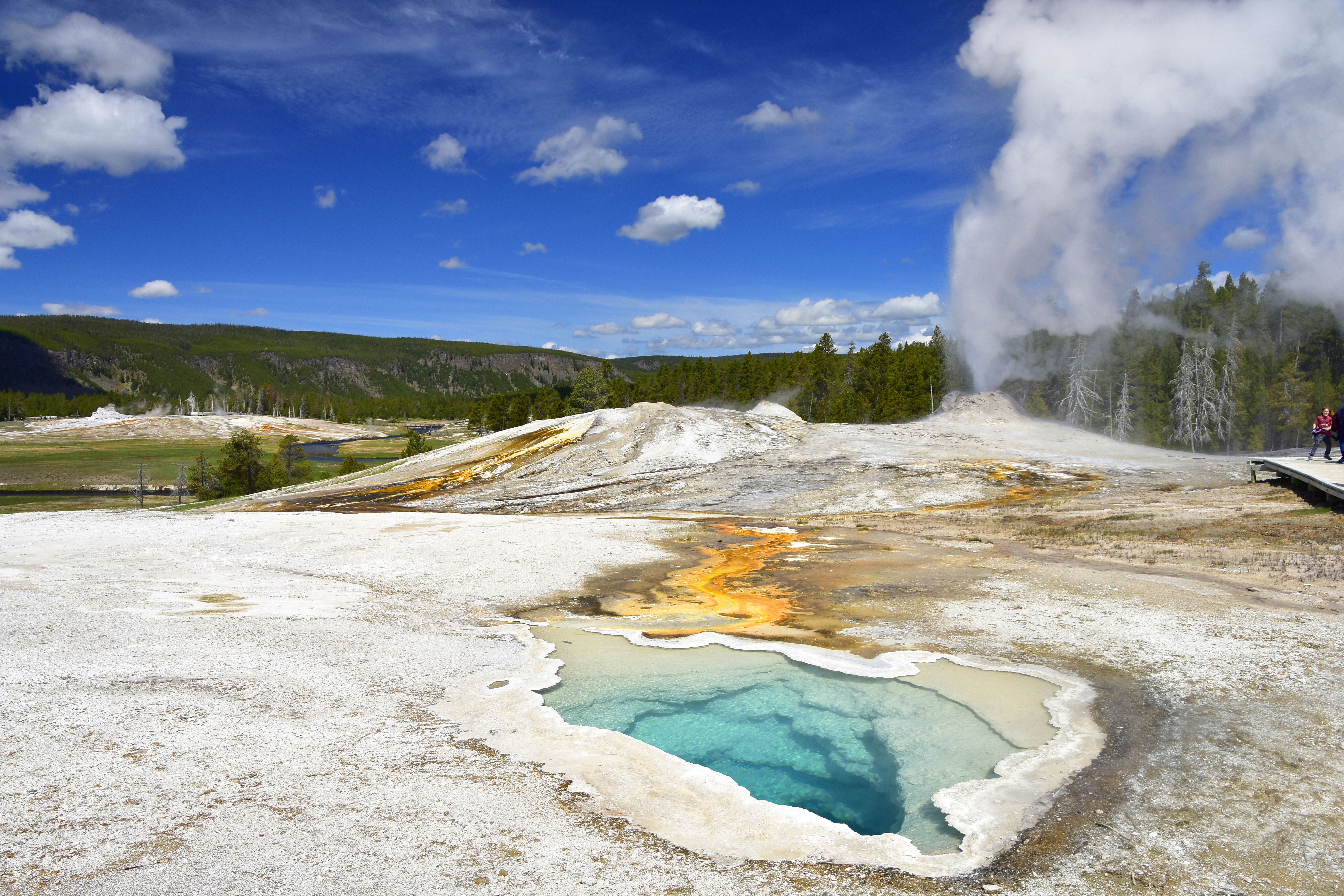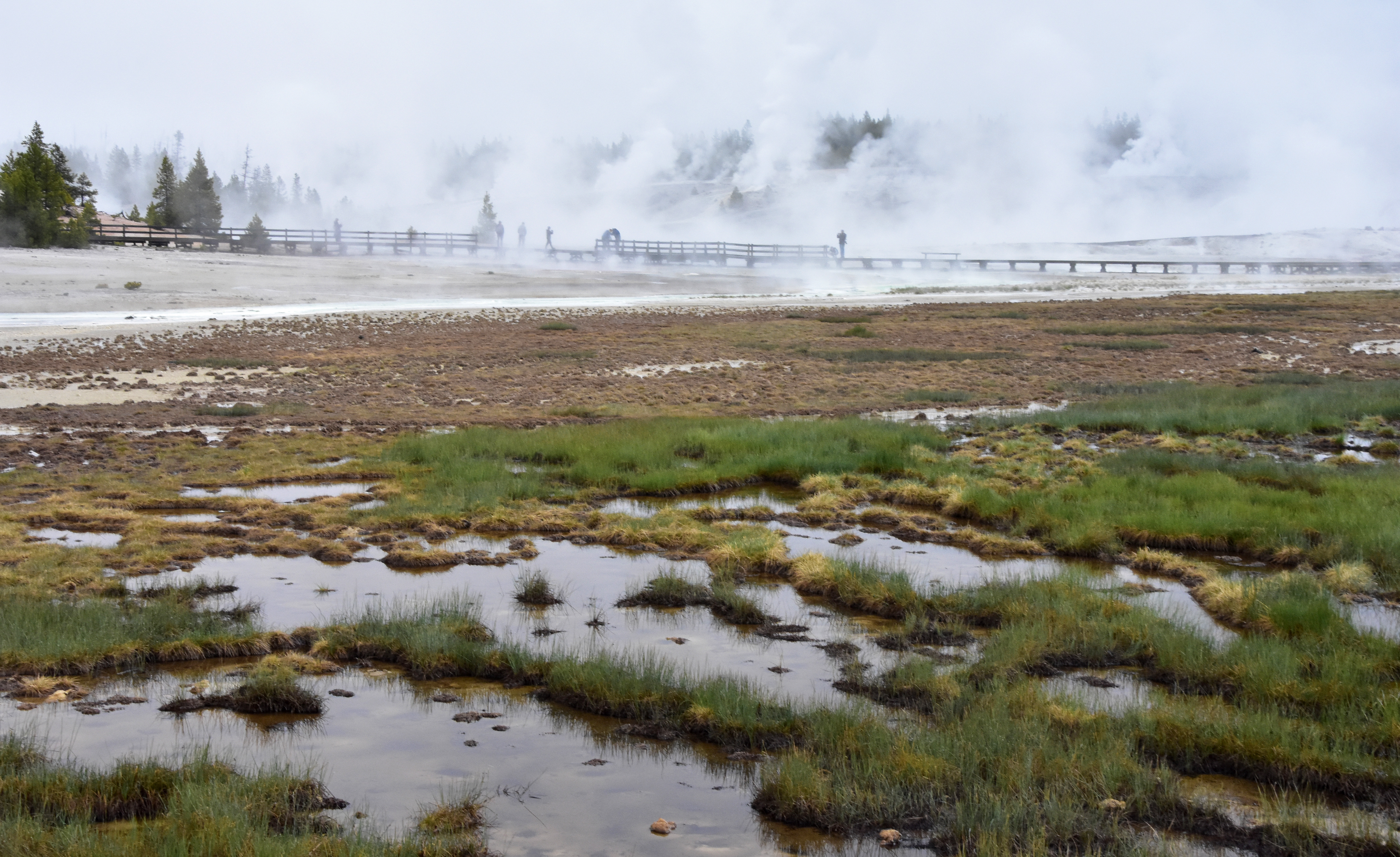Early morning in Norris Geyser Basin – the first visitors brave the boardwalks to view the steaming hot geysers and springs.